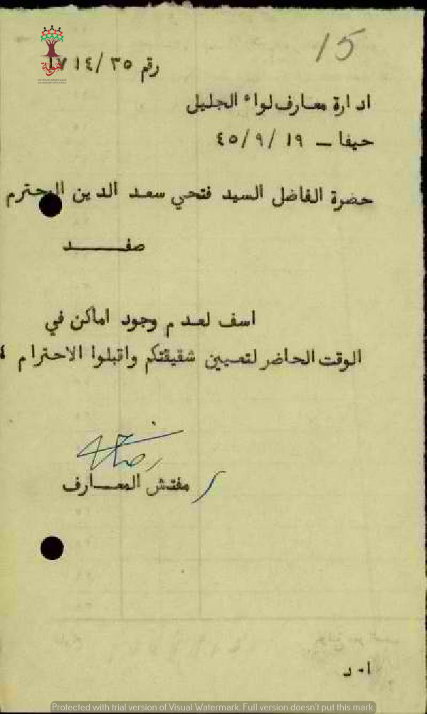 رسالة من مفتش المعارف الى فتحي سعد الدين بخصوص عدم نقل المعلمة روضة سعد الدين