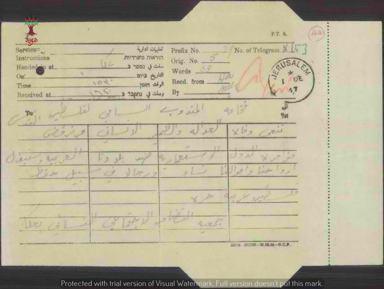 تلغراف مرسل من جمعية التضامن افجتماعي في عكا الى المندوب السامي احتجاجا على قرار تقسيم فلسطين