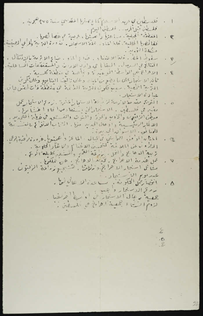 نص محاضرة "الأحراش في فلسطين" مكتوب بخط اليد ألقاها مدير دائرة الأحراش في الجمعية الانجليزية في الكلية العربية خلال العشرينيات، وتتضمن معلومات حول المناخ في فلسطين والتضاريس.