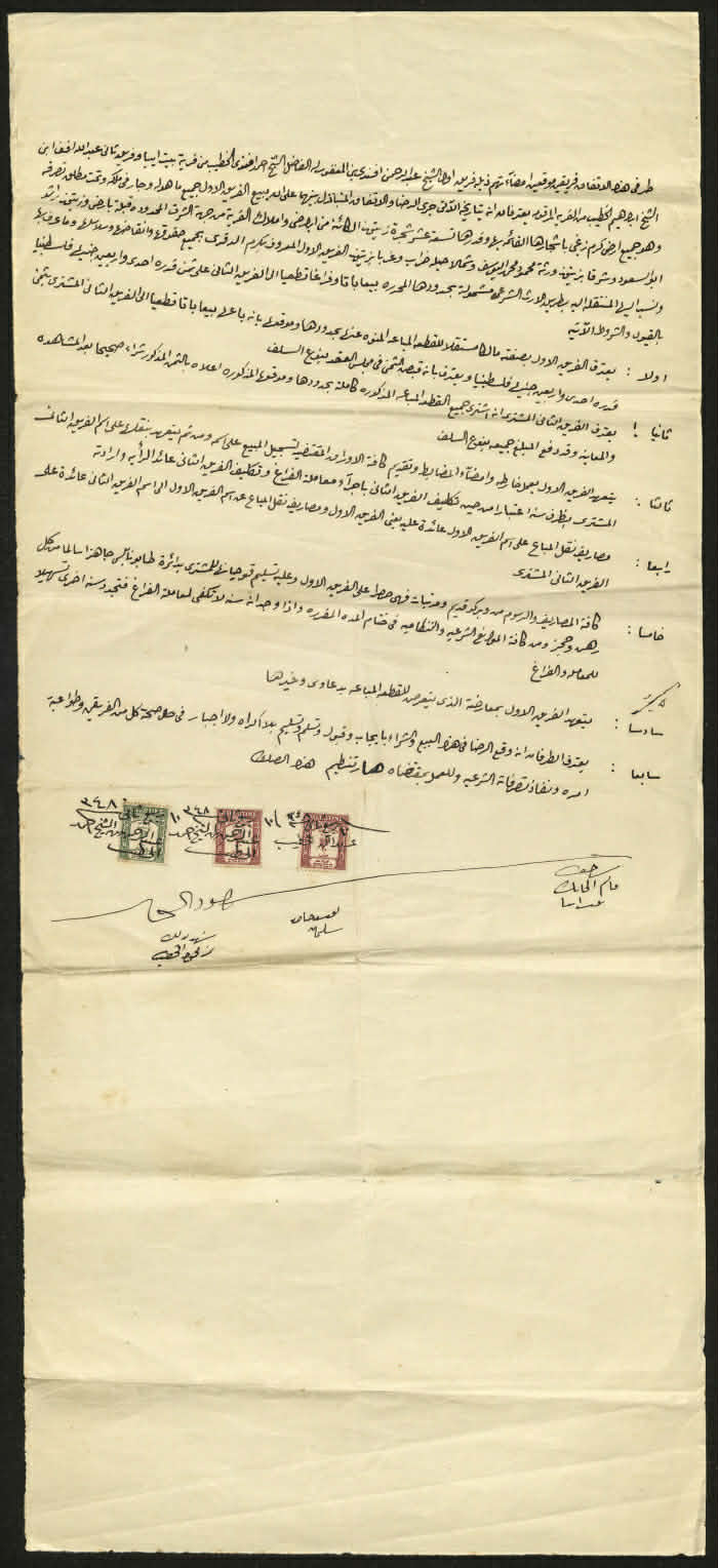 اتفاقية بيع أملاك من عبد الرحمن وأحمد الخطيب (الفريق الأول) إلى عبد الله الخطيب (الفرق الثاني)، تتضمن الاتفاقية تكليف الفريق الأول بتسجيل الاتفاقية في دائرة تسجيل الأراضي في نابلس مع تحمل الفريق الثاني تكاليف نقل الملكية. يظهر في نهاية الاتفاقية طوابع بريدية تحمل اسم فلسطين بثلاث لغات (الانجليزية والعربية والعبرية) مع إضافة الأحرف «الف و يود» بعد اسم فلسطين بالعبرية، وهي اختصار لـ ايريتس يسرائيل، أي ارض اسرائيل.