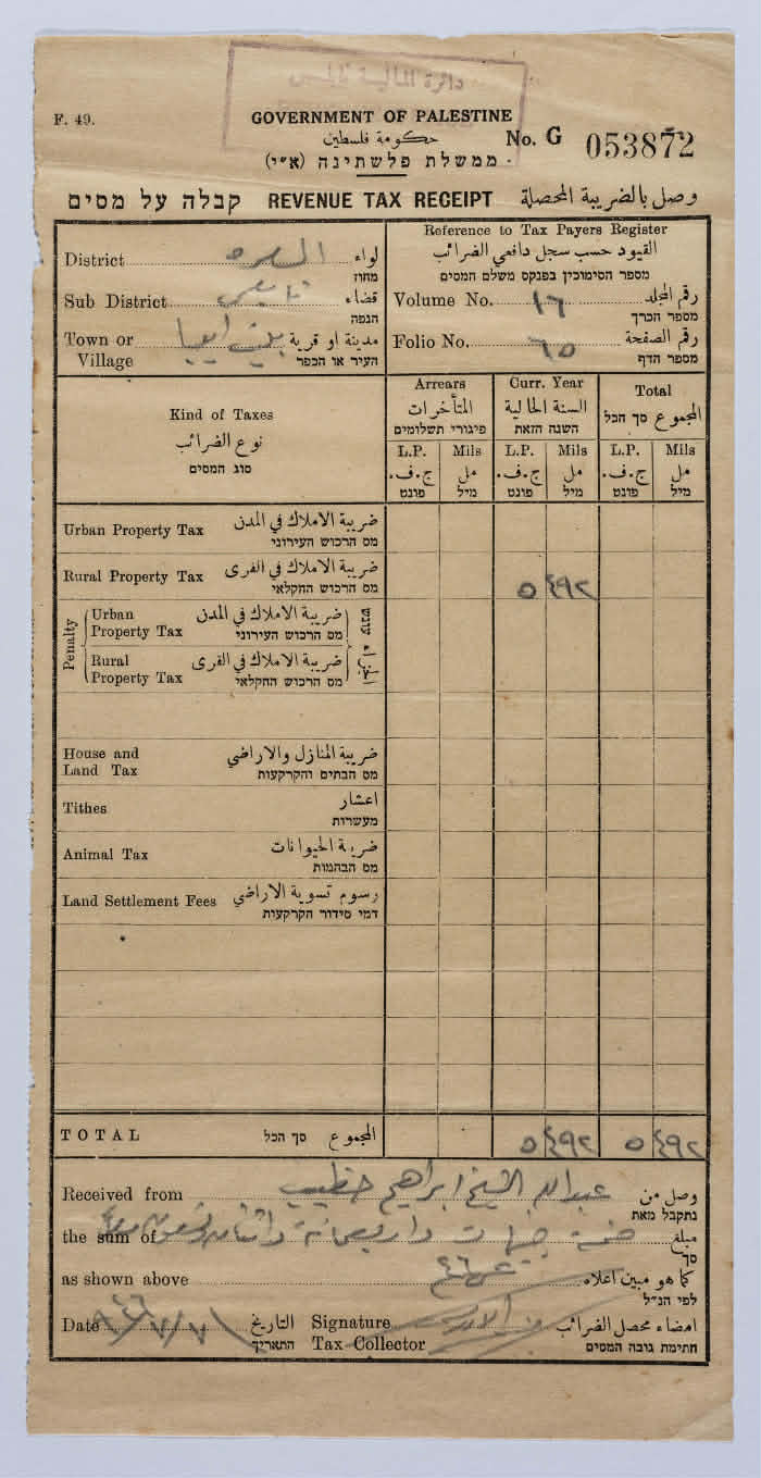 وصل ضريبي باسم عبدالله الخطيب صادر عن دائرة المالية في حكومة فلسطين الانتدابية عام 1946، الوصل مروَّس بعبارة حكومة فلسطين تليها أرض إسرائيل. يظهر في الوثيقة مجموعة أنواع من الضرائب: ضريبة أملاك في المدن والقرى، ضريبة المنازل والأراضي، أعشار، ضريبة الحيوانات، رسوم تسوية الأراضي.