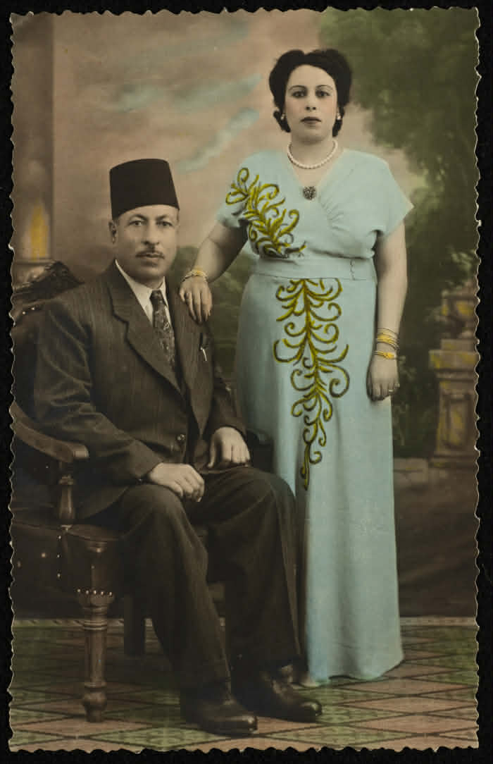 بطاقة بريدية تتضمن صورة ملونة يظهر فيها عبد الله الخطيب وزوجته ثريّا.