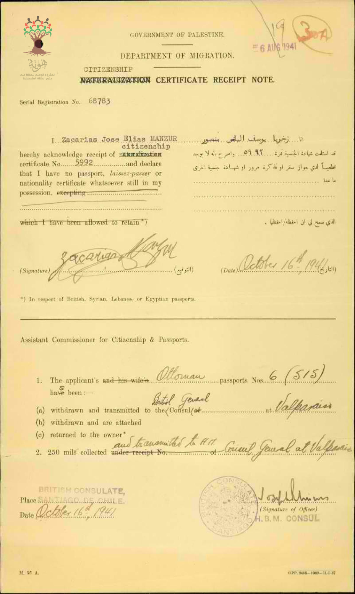 إيصال موقع من زخريا يوسف الياس منصور باستلام شهادة الجنسية الفلسطينية