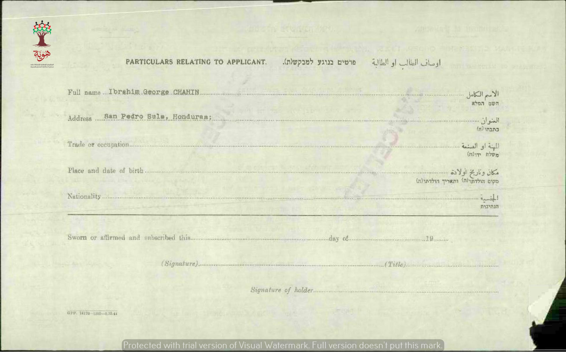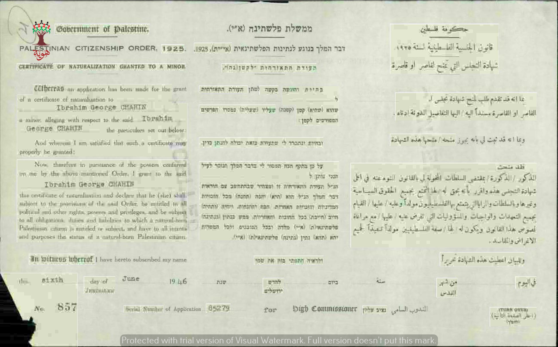 شهادة الجنسية الفلسطينية ل إبراهيم جورج شاهين