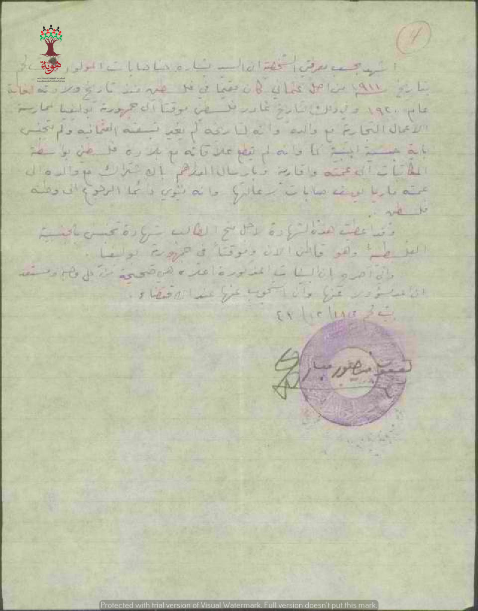 شهادة من المختار للسيد بشارة صابات بخصوص طلب الجنسية بأنه مواليد بيت لحم يونيو 1911 وأنه غادر مؤقتا الى بوليفيا.