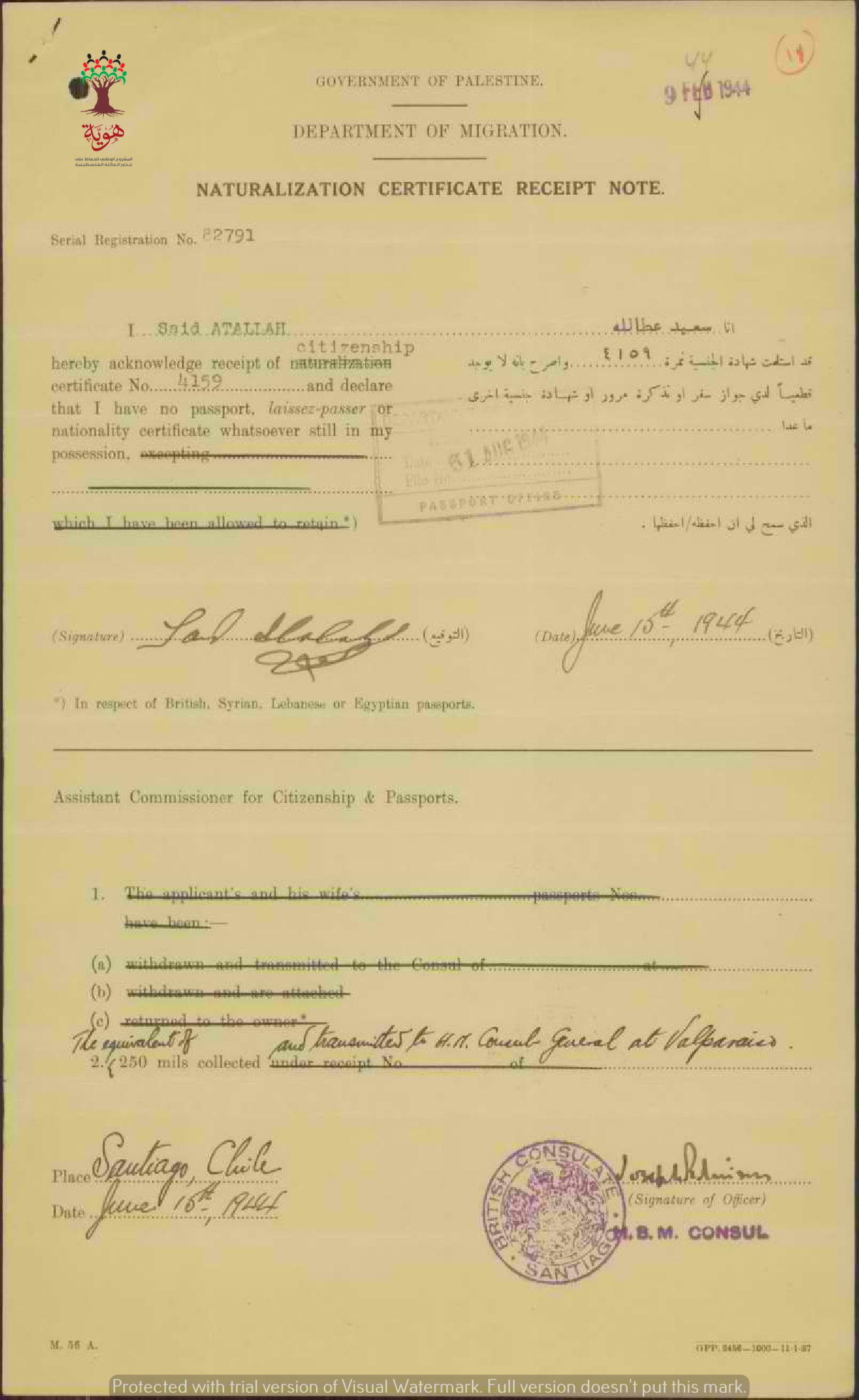 إيصال موقع من سعيد عطا الله باستلام شهادة الجنسية الفلسطينية