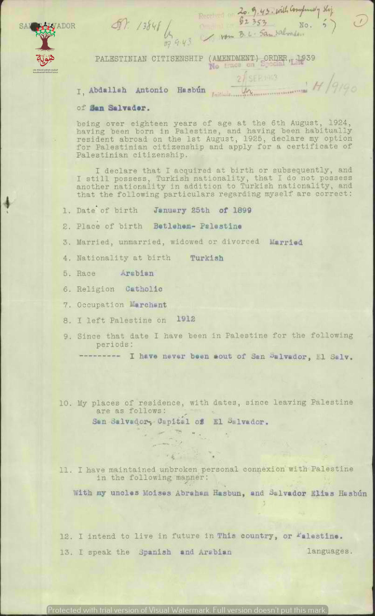 طلب الجنسية الفلسطينية-عبد الله انطون حزبون-بيت لحم/السلفادور