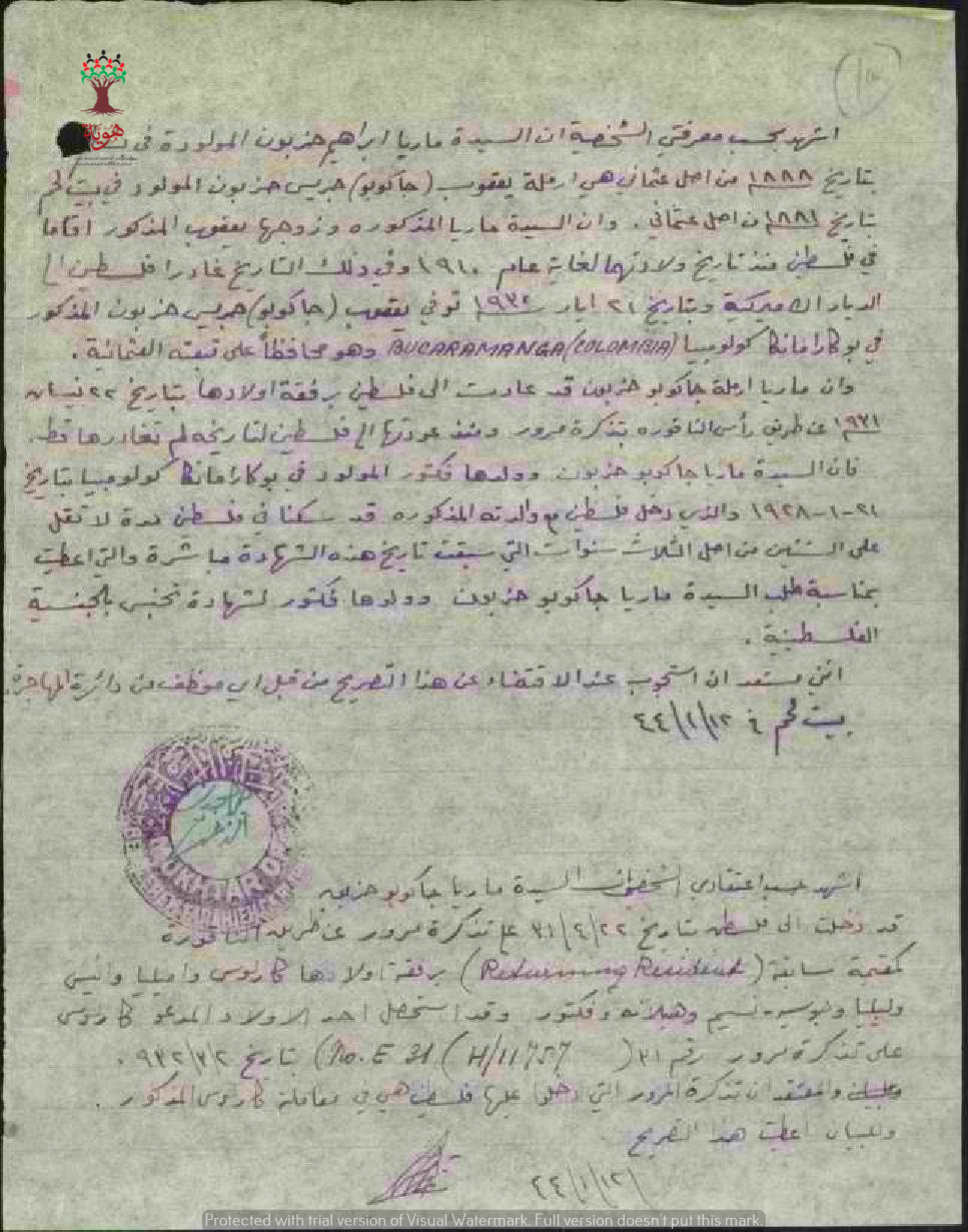 شهادة من المختار للسيد ماريا يعقوب حزبون بخصوص طلب الجنسية بأنها مواليد بيت لحم سنة 1888.