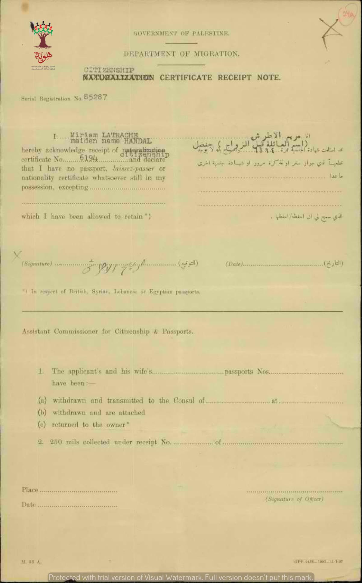 إيصال موقع من مريم الأطرش حنضل باستلام شهادة الجنسية الفلسطينية