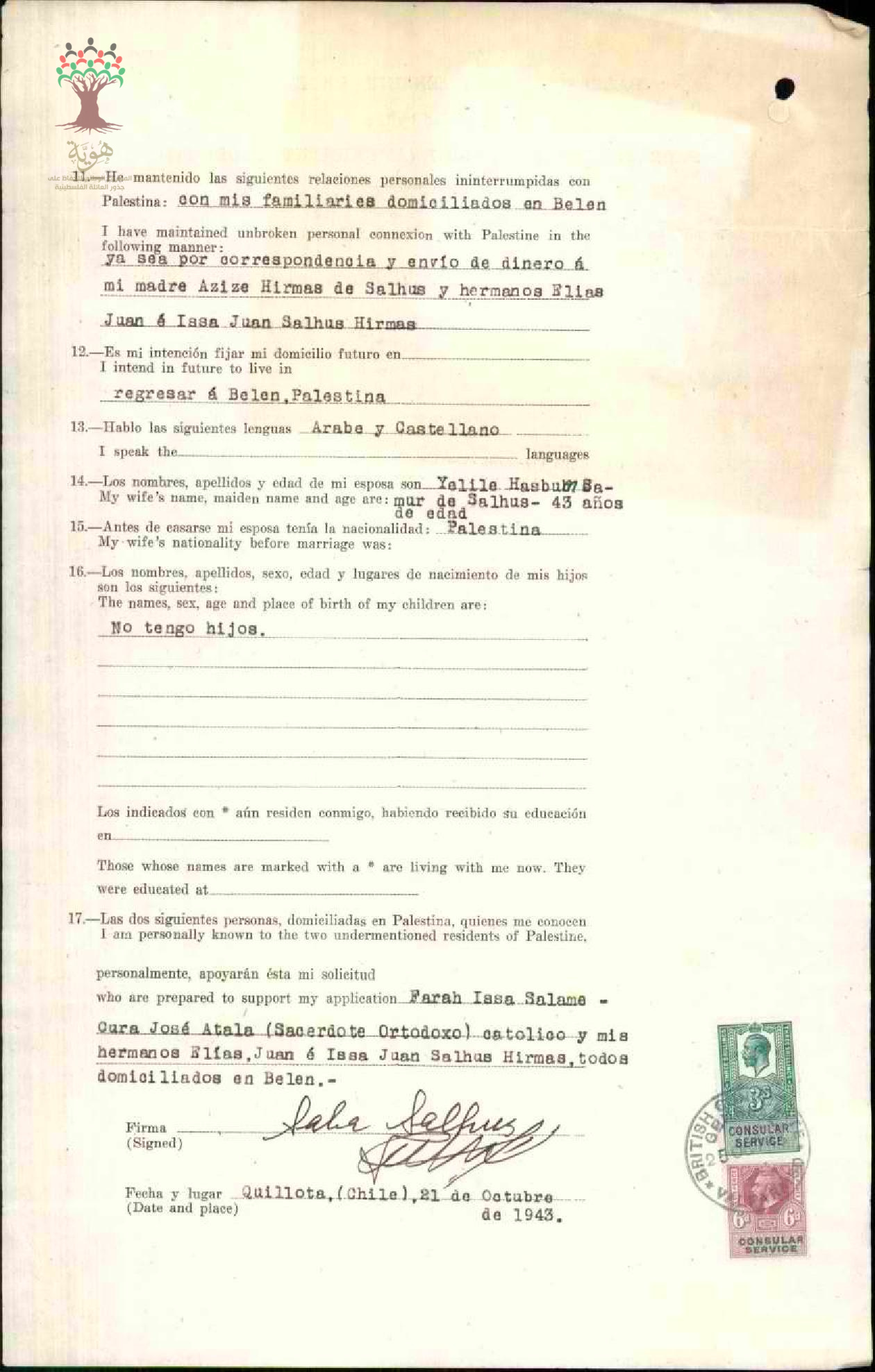طلب الجنسية الفلسطينية-سابا حنا سلعوس-بيت لحم/تشيلي