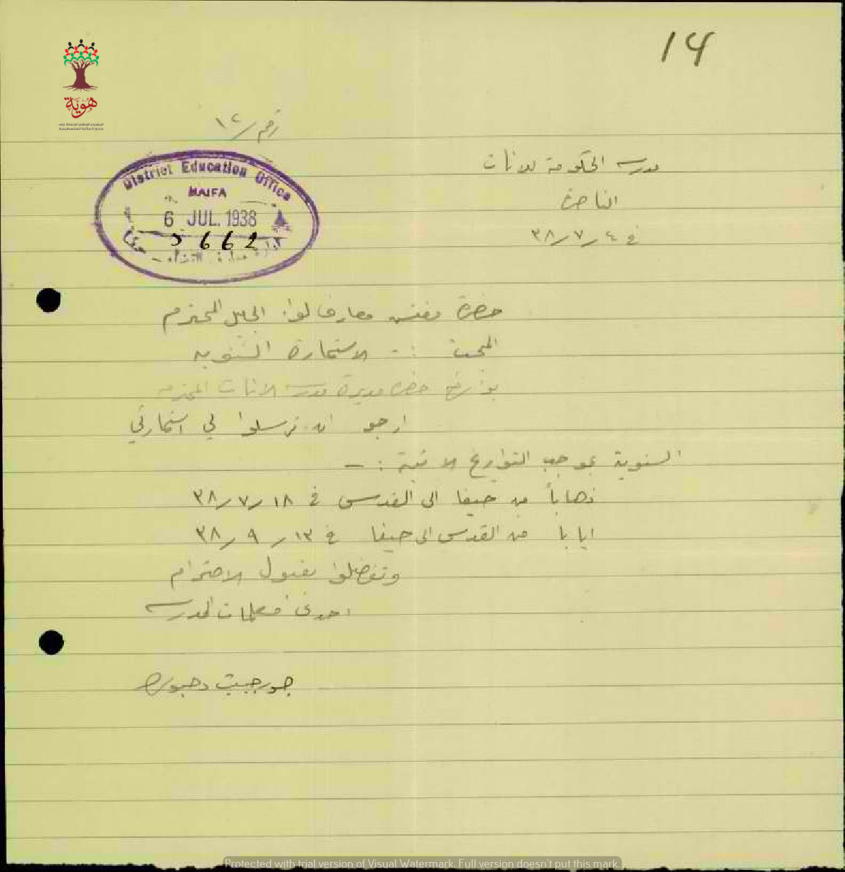 رسالة من المعلمة جورجيت دحبورة الى مفتش المعارف تطلب فيها استمارة سفرها السنوية