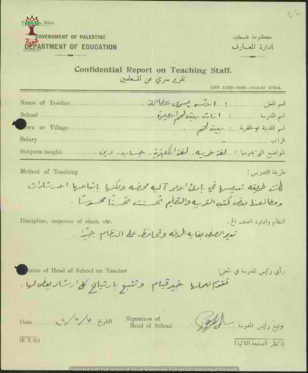 تقرير تفصيلي عن أداء المعلمة يسرى وديع عطا الله في مدرسة بنات بيت لحم سنة 1942