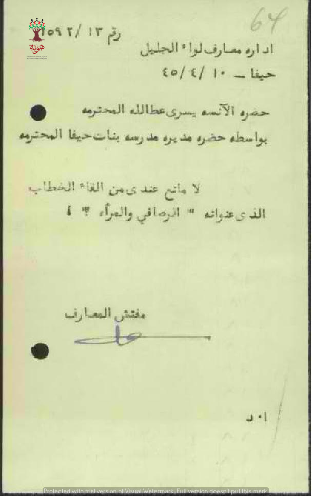 رسالة من مفتش المعارف الى المعلمة يسرى عطا الله بالموافقة على إلقائها للخطاب