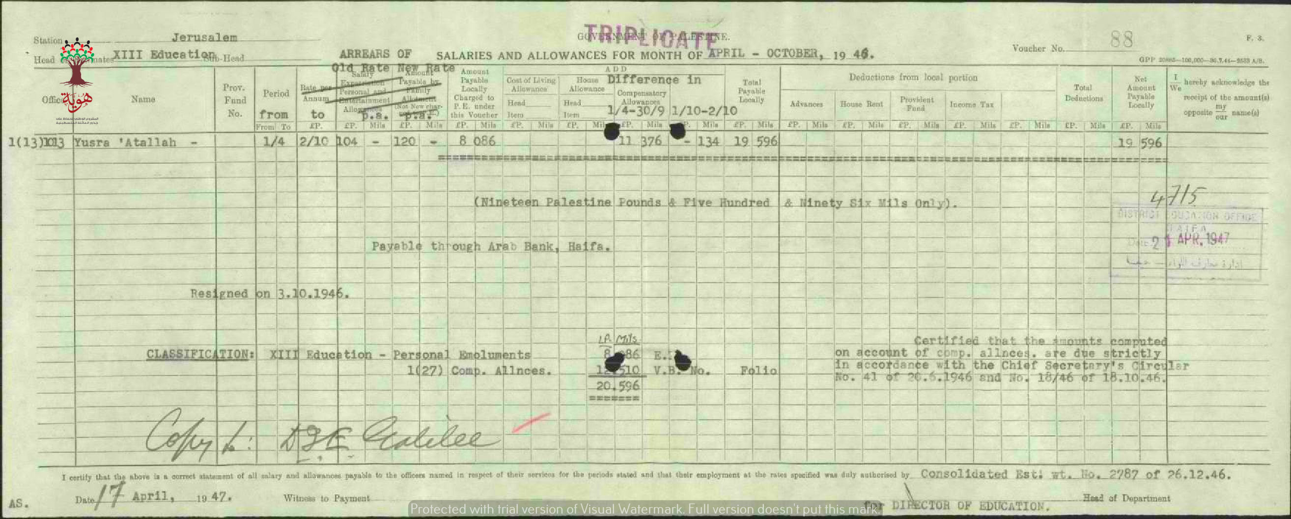 كشف حساب صادر عن البنك العربي للمعلمة يسرى عطا الله