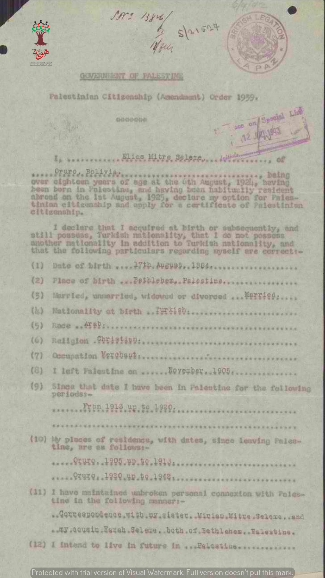 طلب الجنسية الفلسطينية-الياس متري سلامة-بيت لحم/تركيا