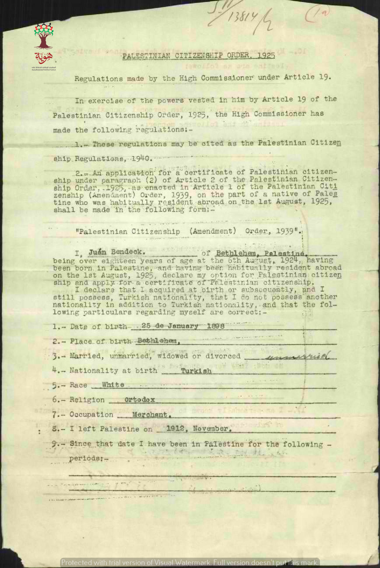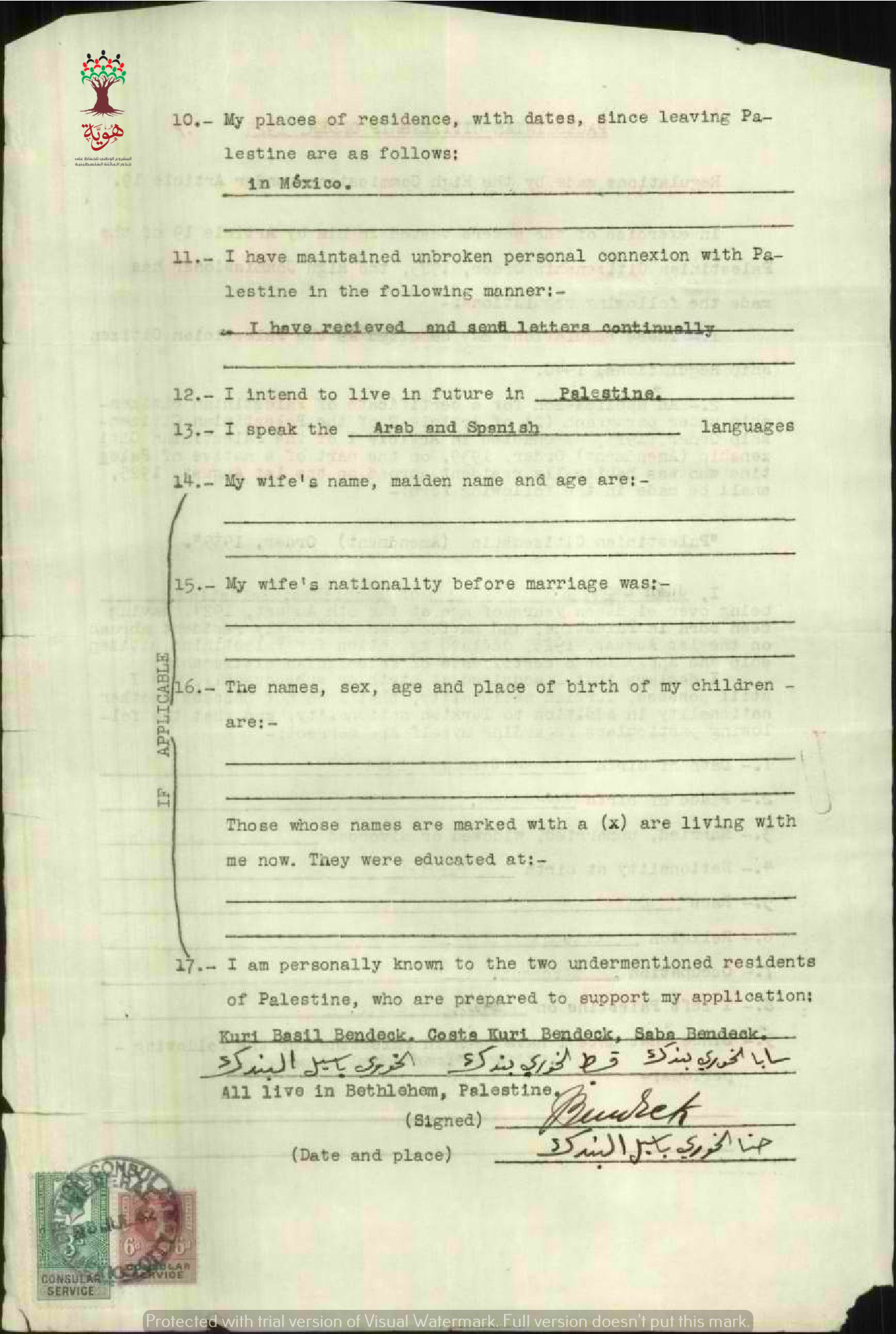 طلب الجنسية الفلسطينية-حنا بندك-بيت لحم/المكسيك