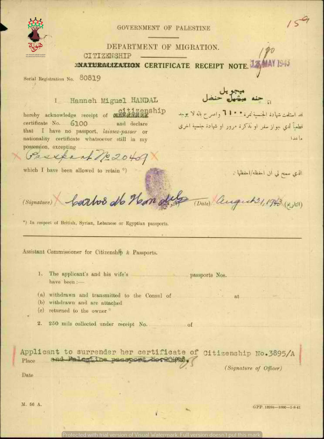 إيصال موقع من حنة ميغويل حنضل باستلام شهادة الجنسية الفلسطينية
