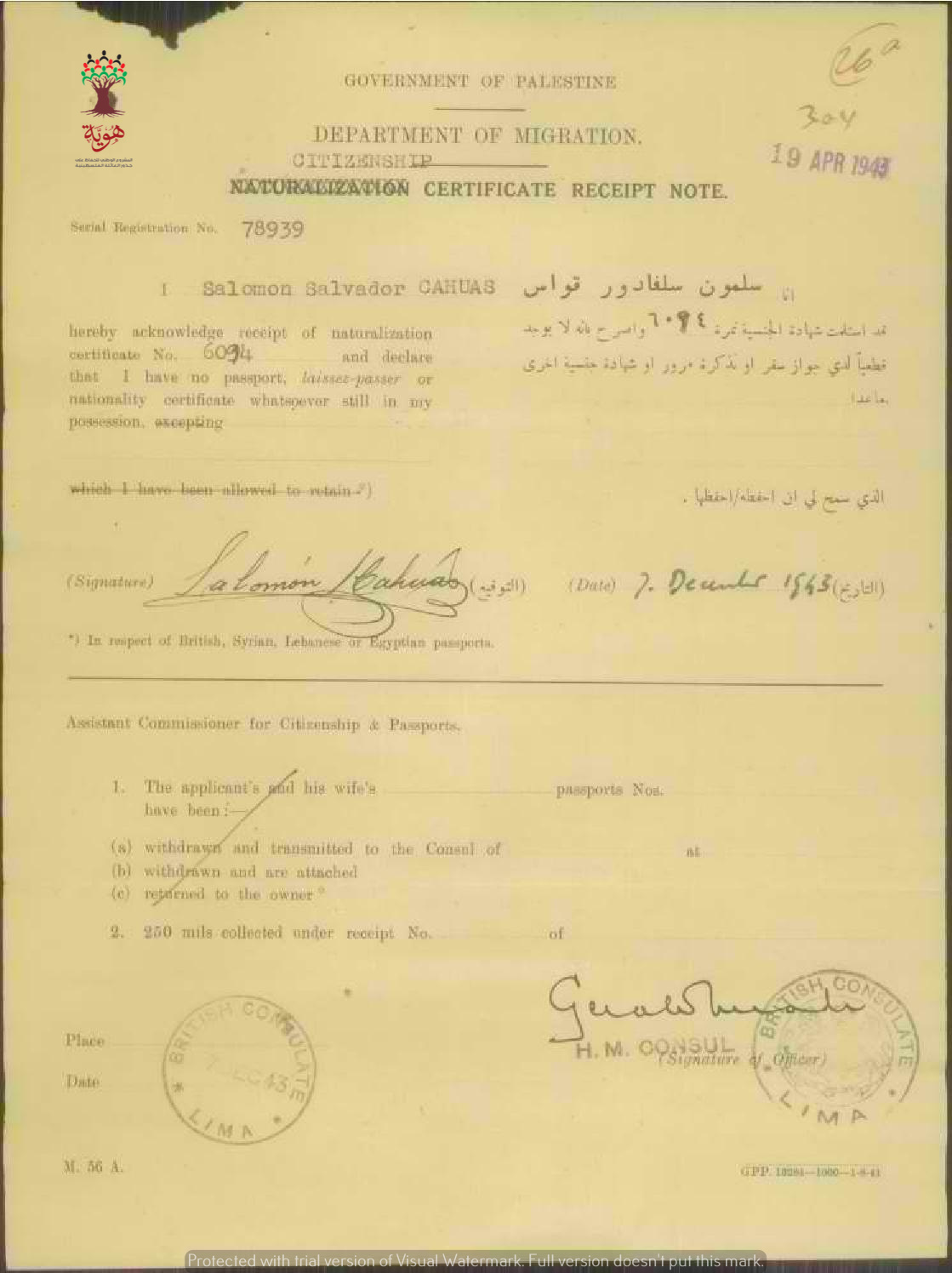 إيصال موقع من سلمون سلفادور قواس باستلام شهادة الجنسية الفلسطينية