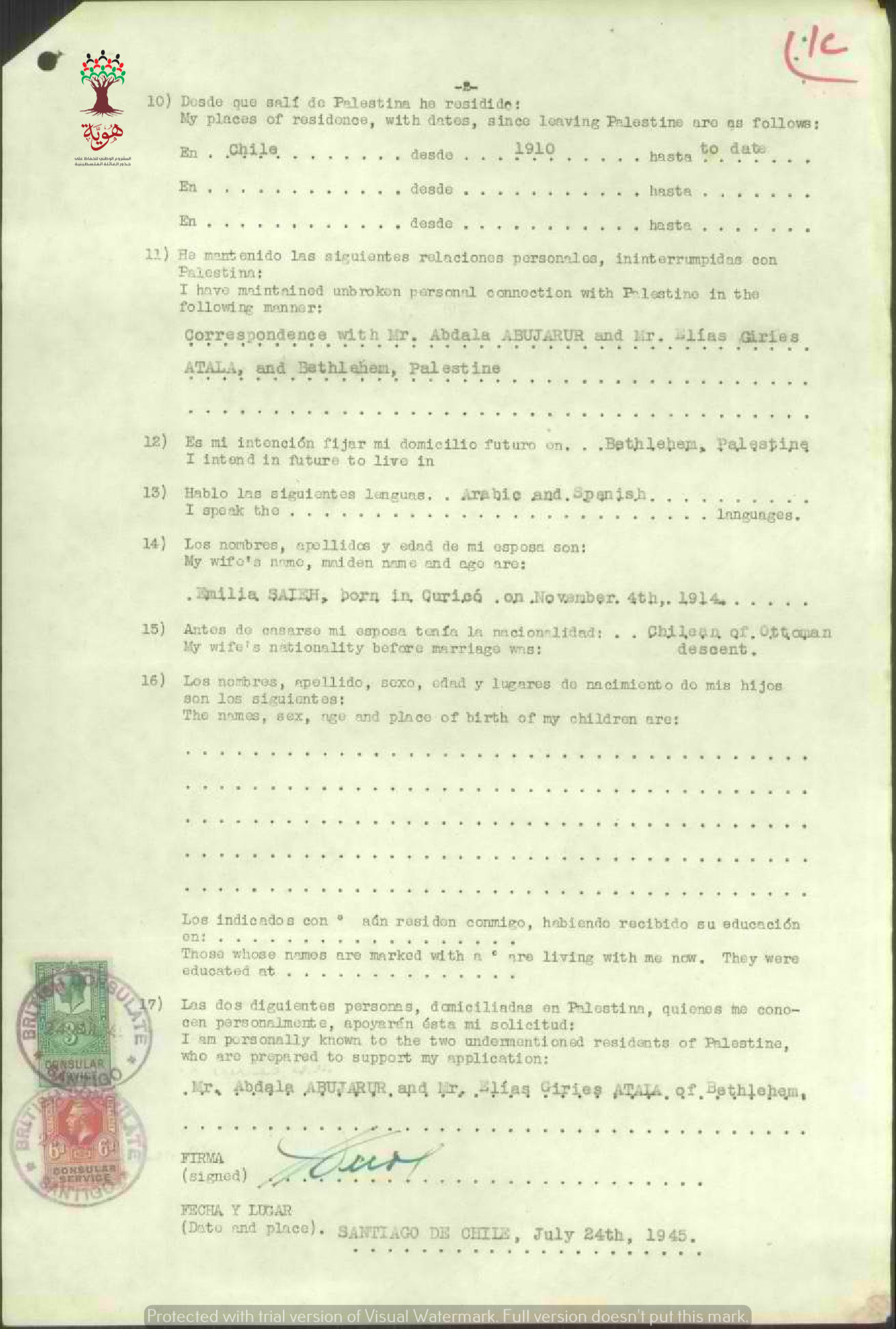 طلب الجنسية الفلسطينية-سلمون أبو زعرور-بيت لحم/تشيلي