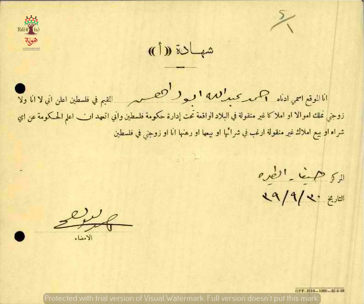 شهادة نفي ملكية المعلم أحمد عبد الله أبو داهش - حيفا - مدرسة الطيرة