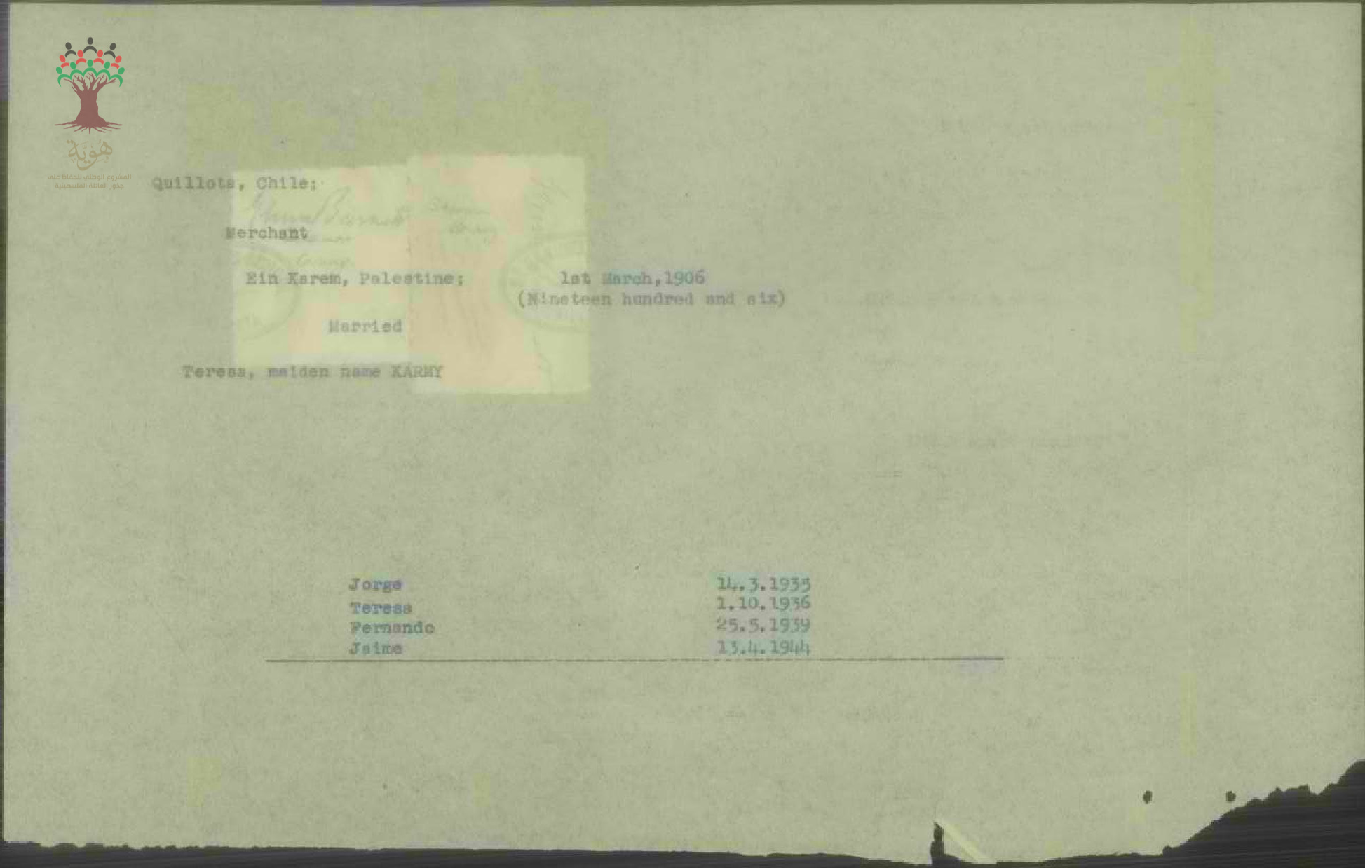 ورقة بيانات سليمان جورج كارمي المرفقة بطلب الجنسية وزوجته تيريز كارمي