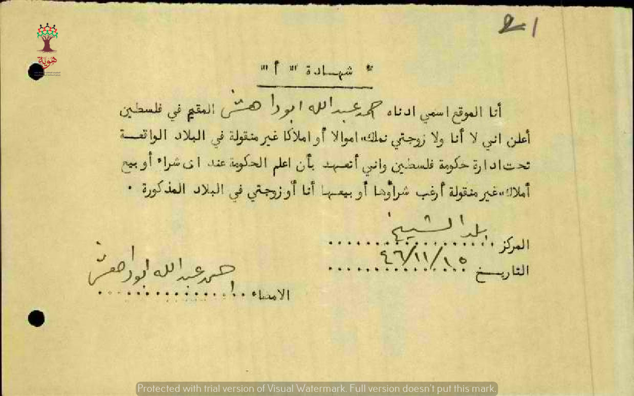 شهادة نفي ملكية المعلم عبد الله أبو داهش - حيفا - مدرسة بلد الشيخ
