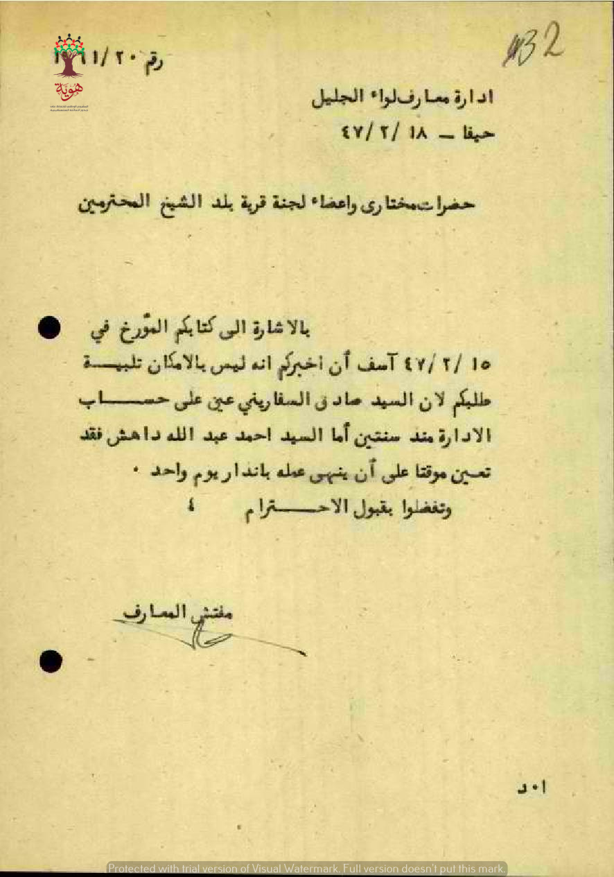 رسالة من مفتش المعارف الى مخاتير ووجهاء بلد الشيخ بخصوص عدم امكانية وقف نقل المعلم أحمد أبو داهش