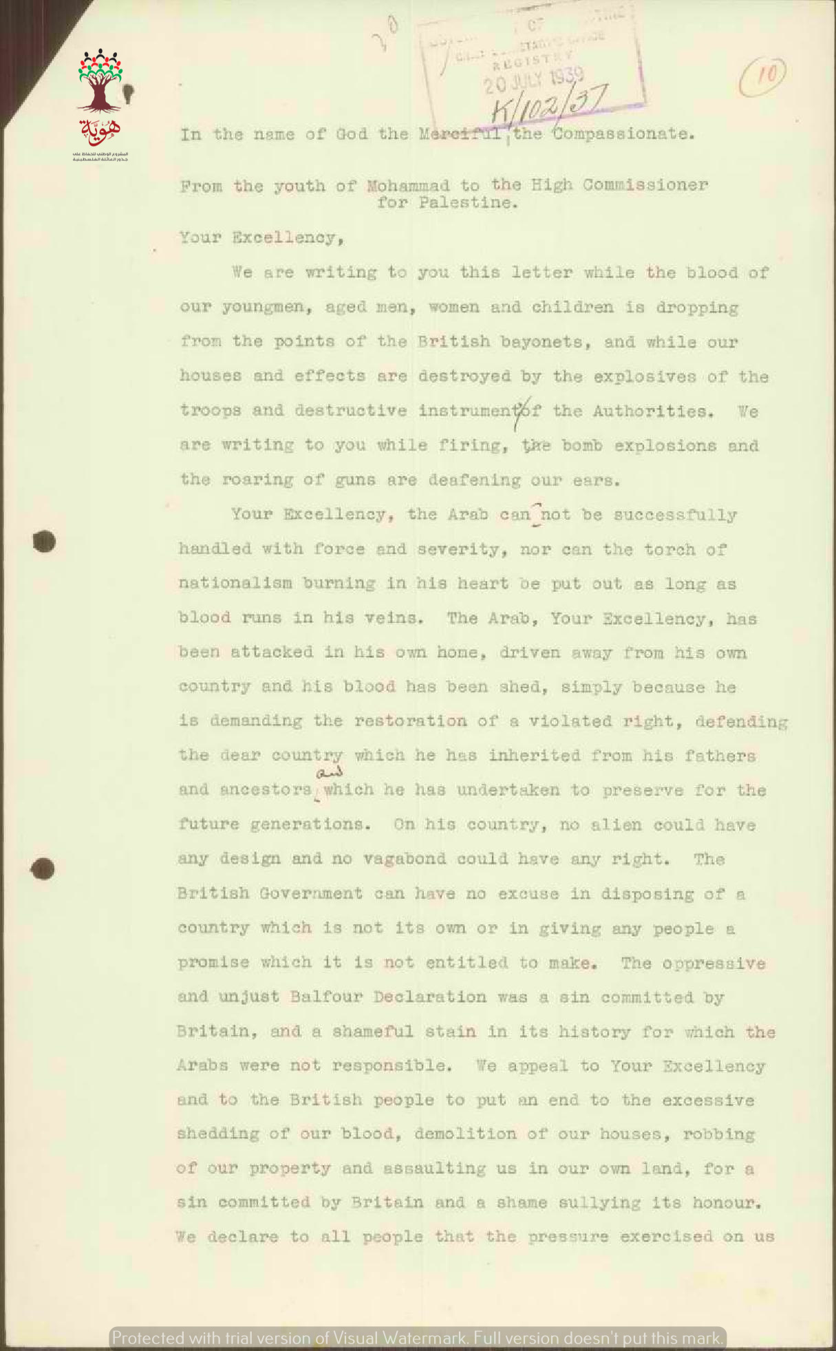 كلمة شباب محمد صلى الله عليه وسلّم الى المندوب السامي اعتراضا على الاعتداءات الإنجليزية على العرب والتهجم على أمين الحسيني
