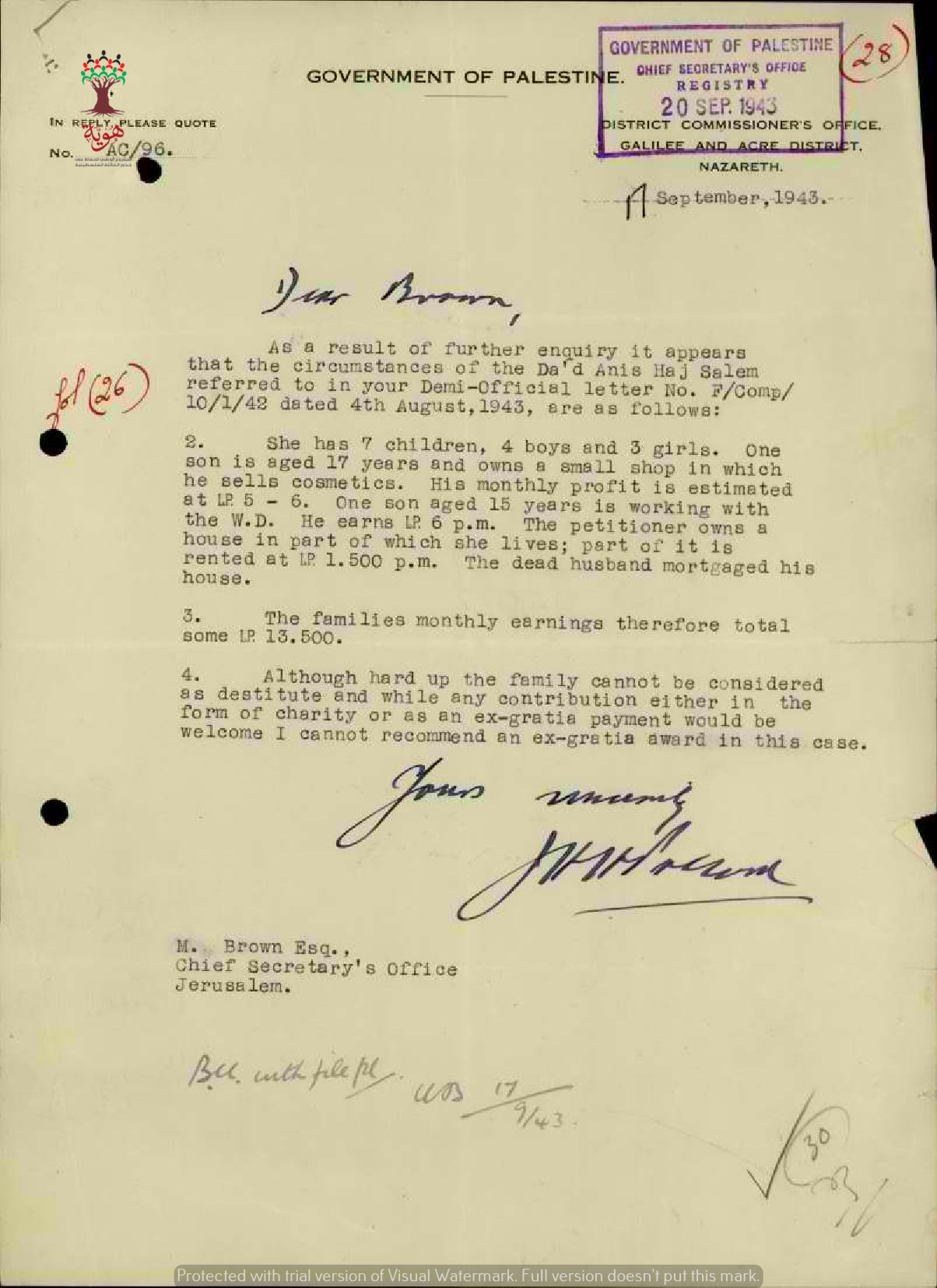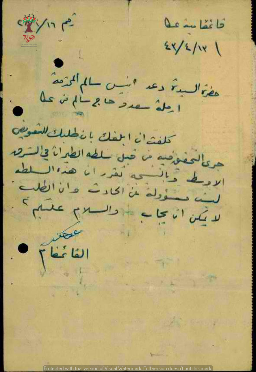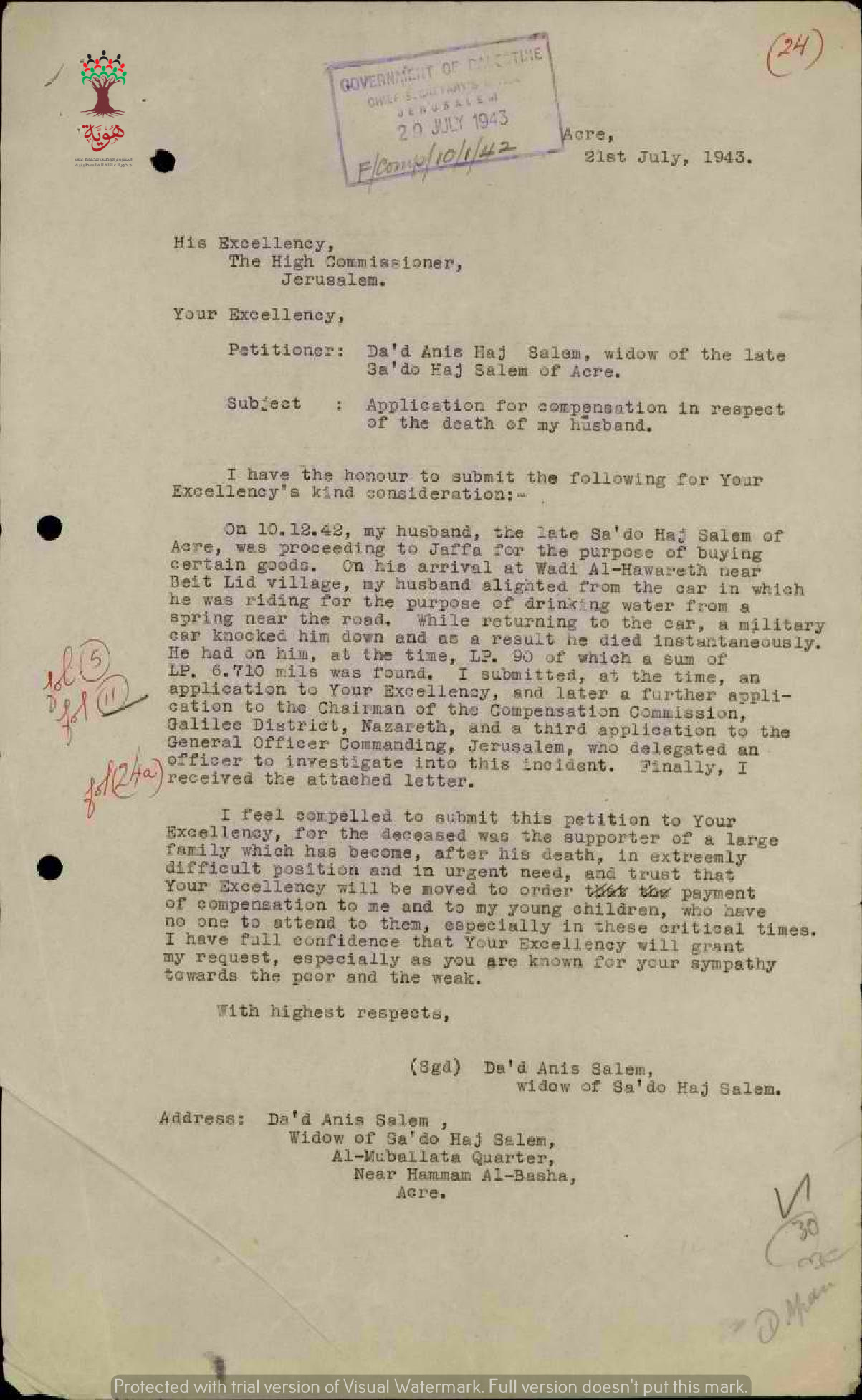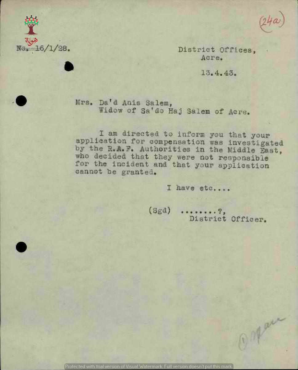 مجموعة وثائق بخصوص طلب دعد أنيس سالم تعويض عن وفاة زوجها سعدو حاج سالم إثر حادثة دهس بواسطة سيارة عسكرية ورفض طلبها للتعويض.
