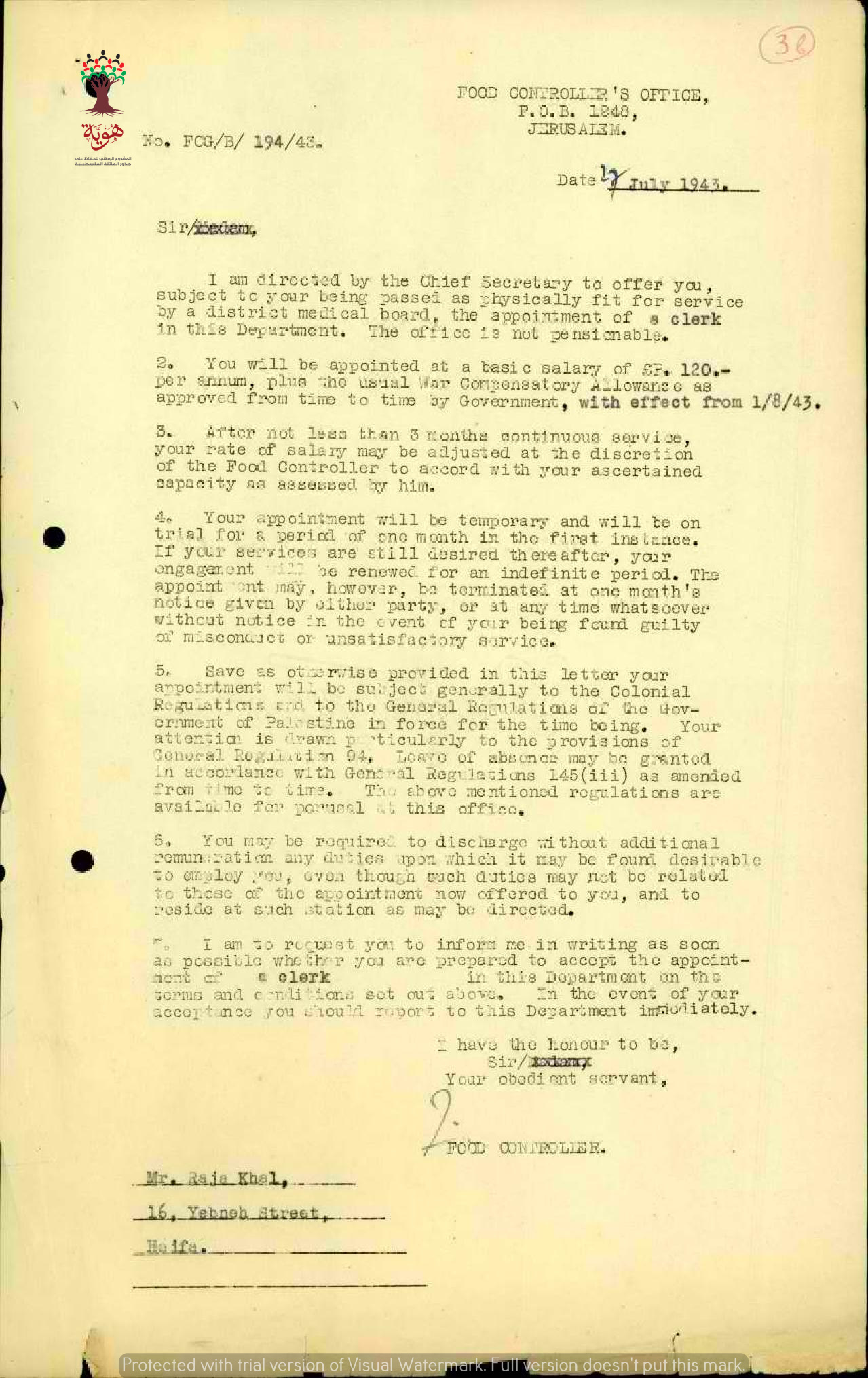 رسالة من مراقب الأغذية الى رجا الخال بخصوص تعيينه بشكل مؤقت في دائرة التغذية