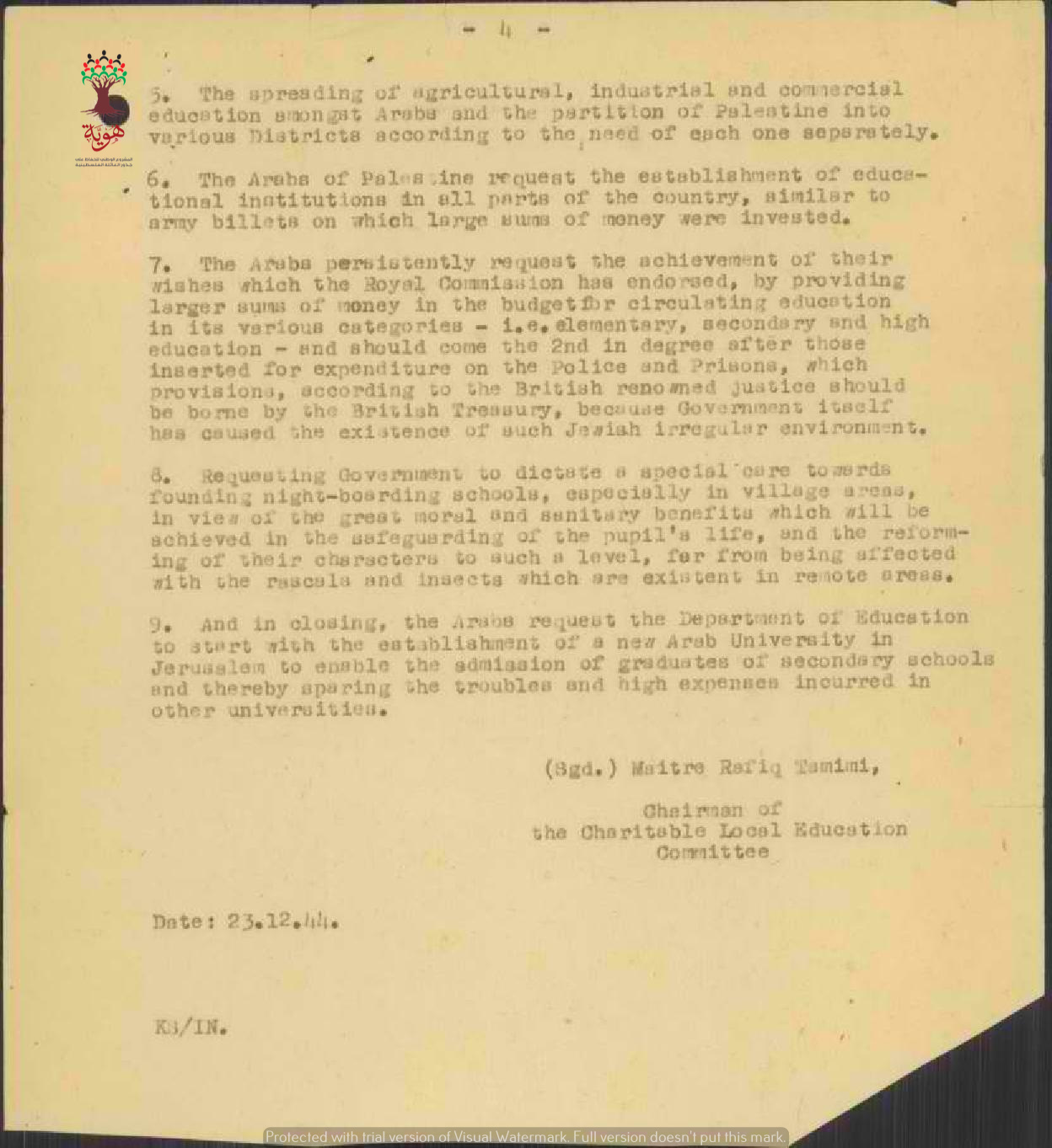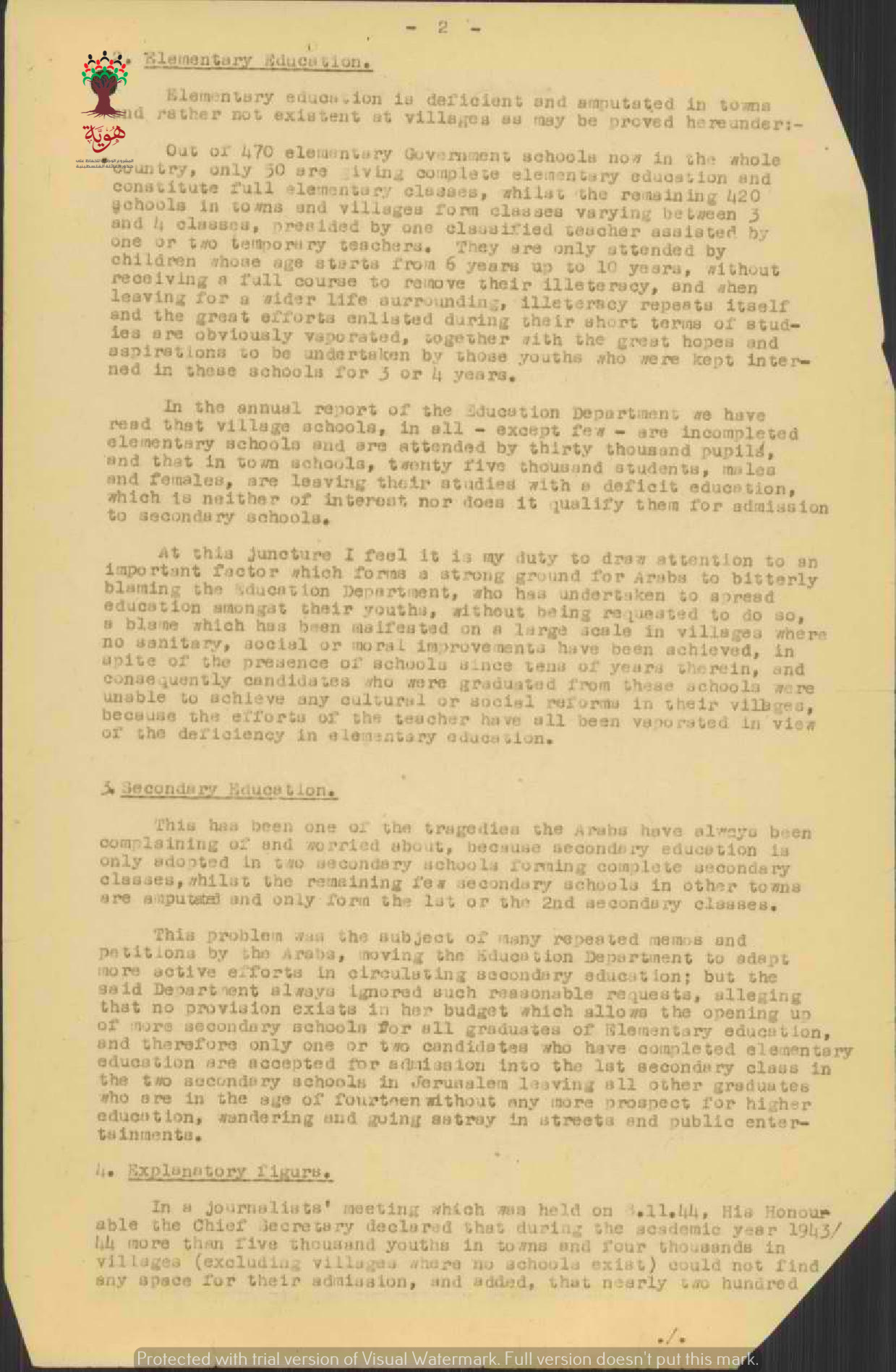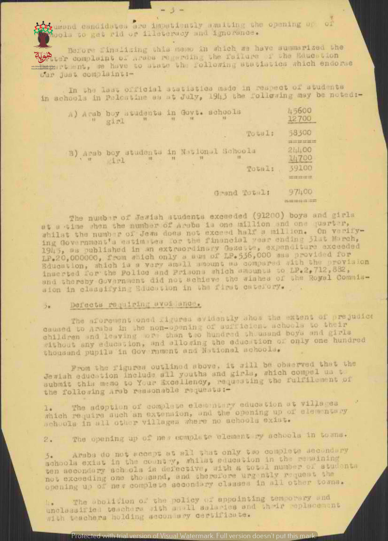 تقرير مفصل موجه الى المندوب السامي بخصوص حاجة فلسطين الى عدد أكبر من المدارس