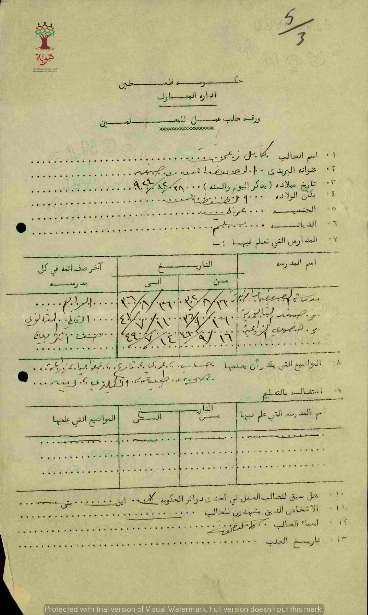 ورقة طلب عمل مقدمة من المعلم كامل زغموت - مدرسة الخالصة