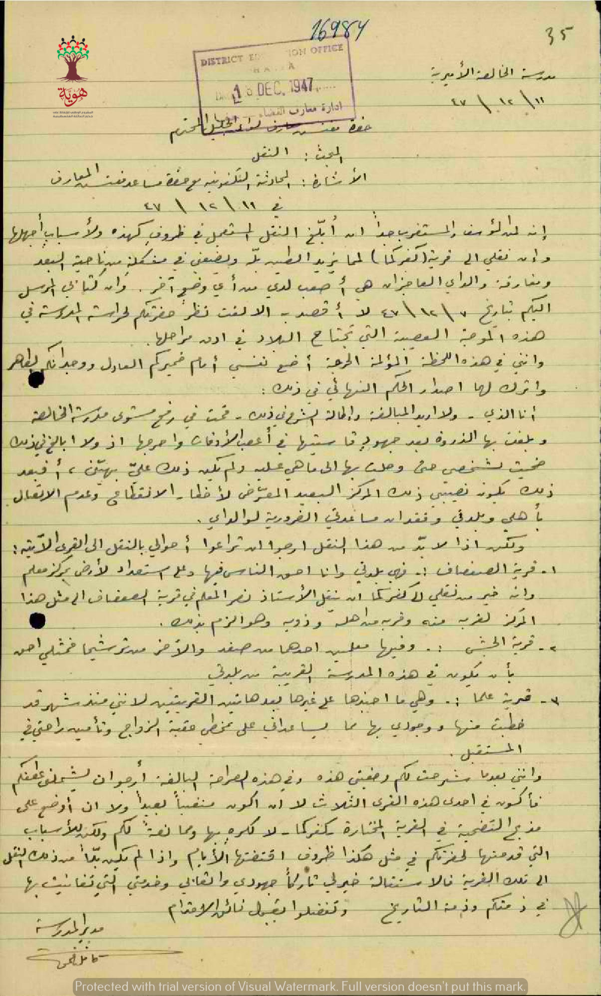 رسالة من المعلم كامل زغموت الى مفتش المعارف يعترض فيها على نقله الى كفركما