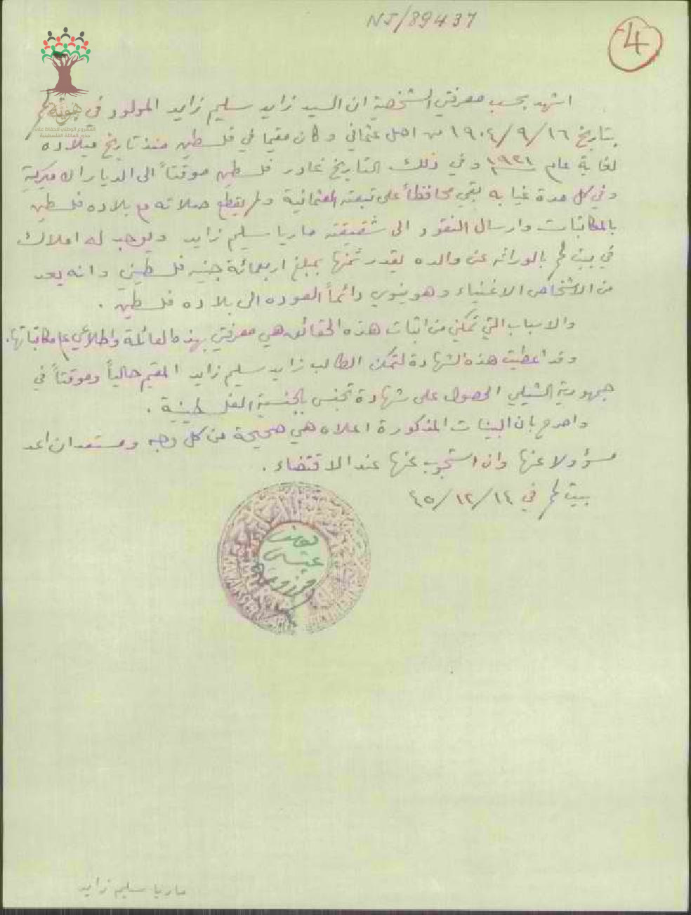 شهادة من المختار يوسف عيسى مرزوق للسيد سليم زايد بخصوص طلب الجنسية/بيت لحم