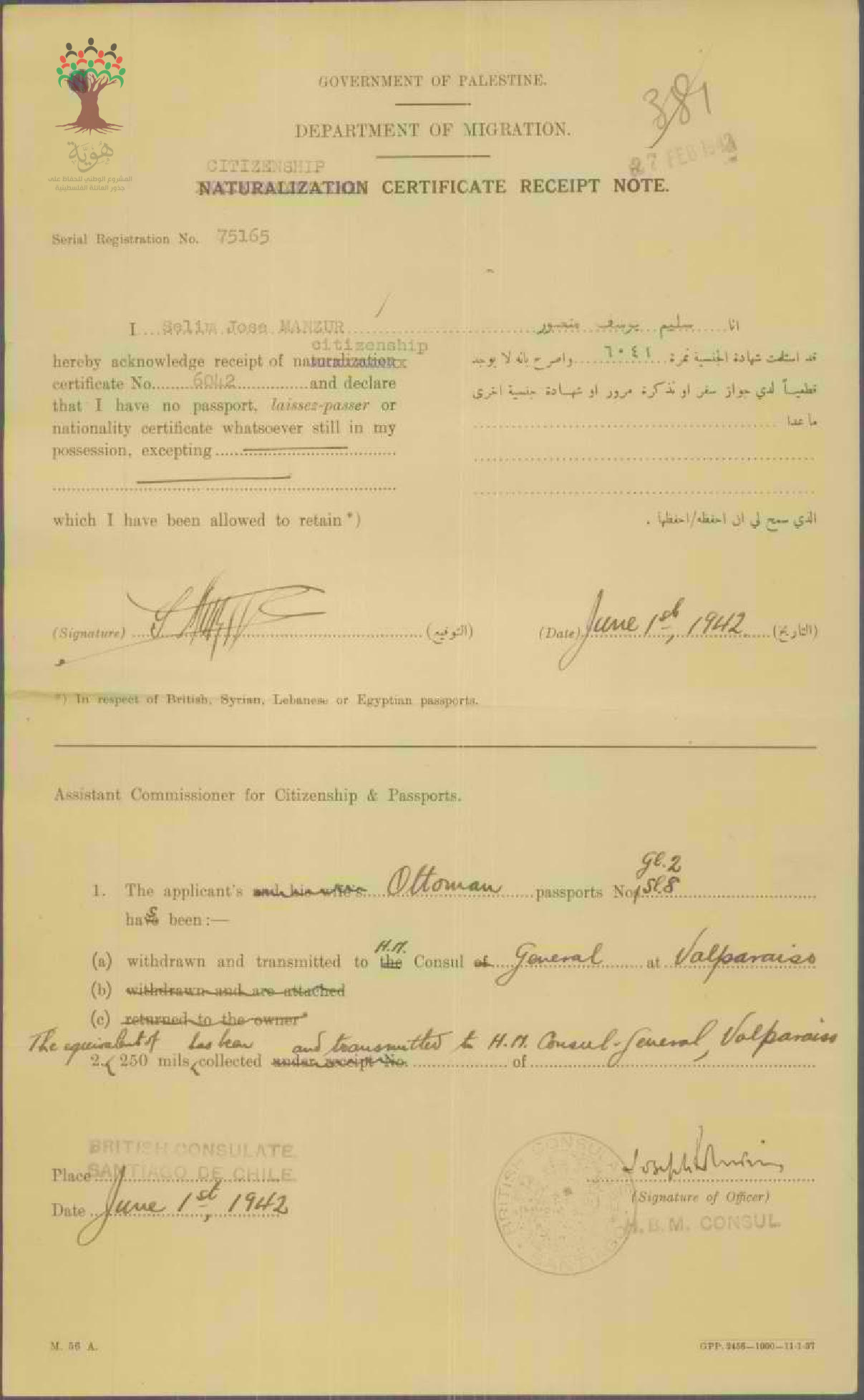 إيصال موقع من سليم يوسف منصور باستلام شهادة الجنسية الفلسطينية
