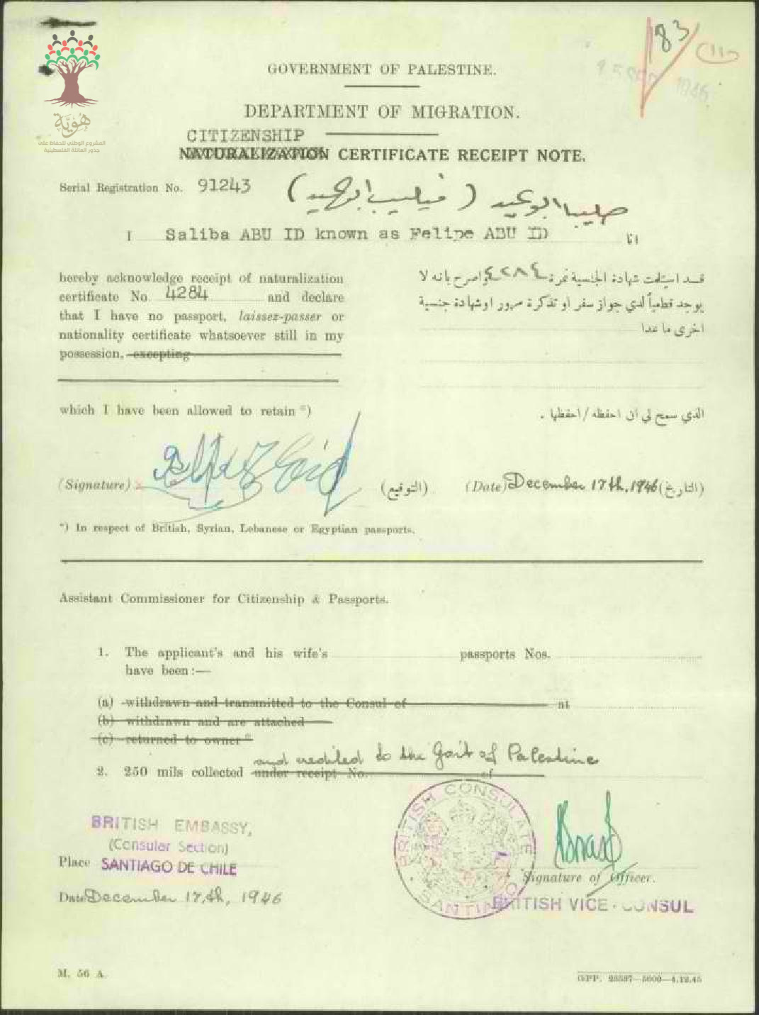 إيصال موقع من صليبا أبو عيد باستلام شهادة الجنسية الفلسطينية