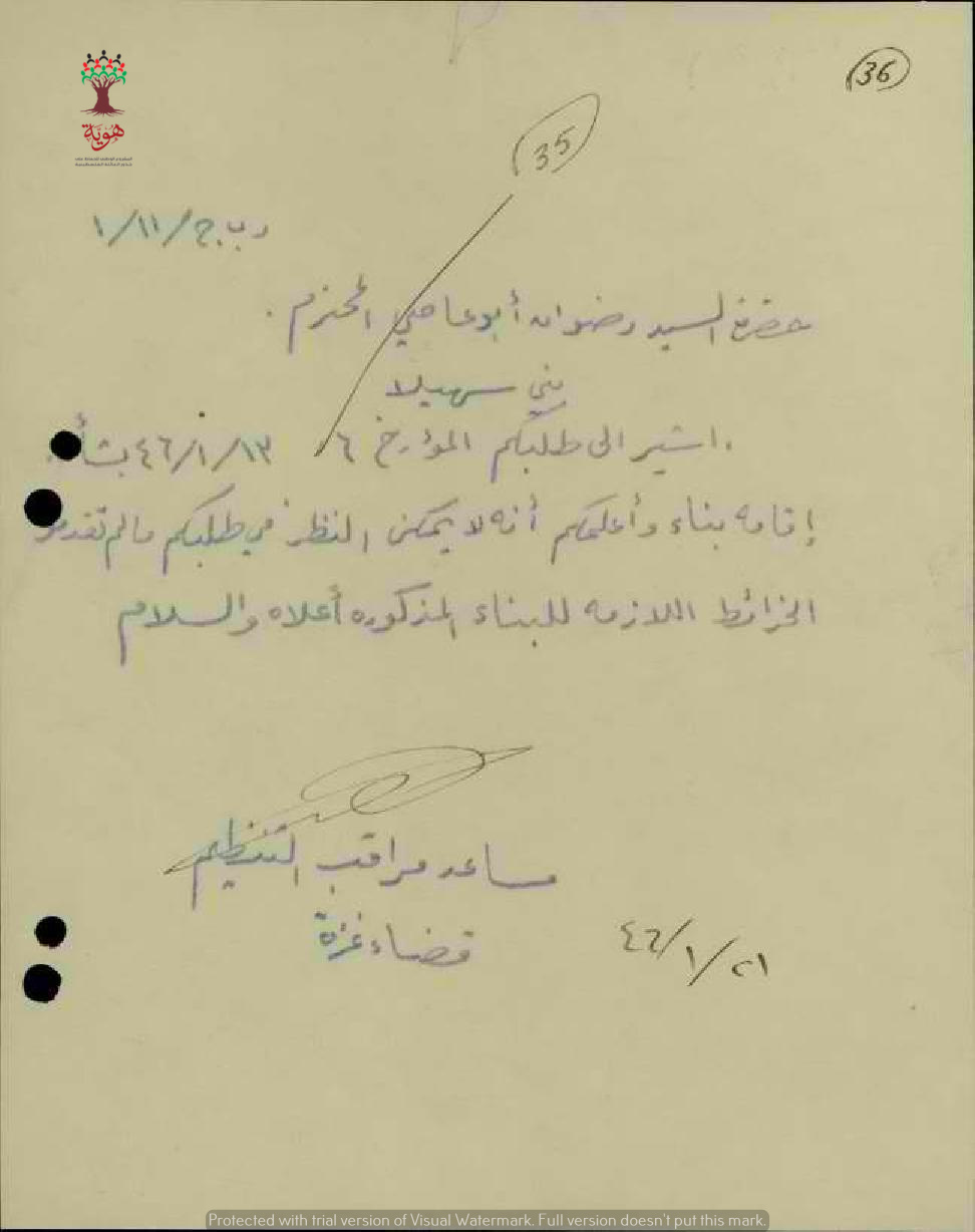 رسالة من مساعد مراقب التنظيم في غزة الى رضوان أبو عاصي بخصوص طلب بنائه حيث لا يمكن إعطائه الرخصة حتى يقدم الخرائط الازمة.