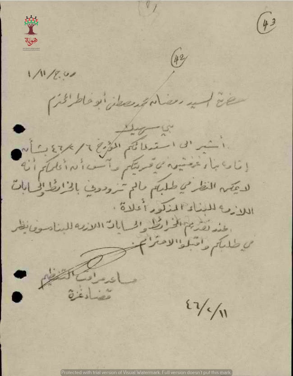 رفض طلب البناء ل رمضان محمد مصطفى أبو خاطر بتاريخ 6-2-1946 بسبب عدم تقديم خرائط البناء والحسابات المطلوبة.