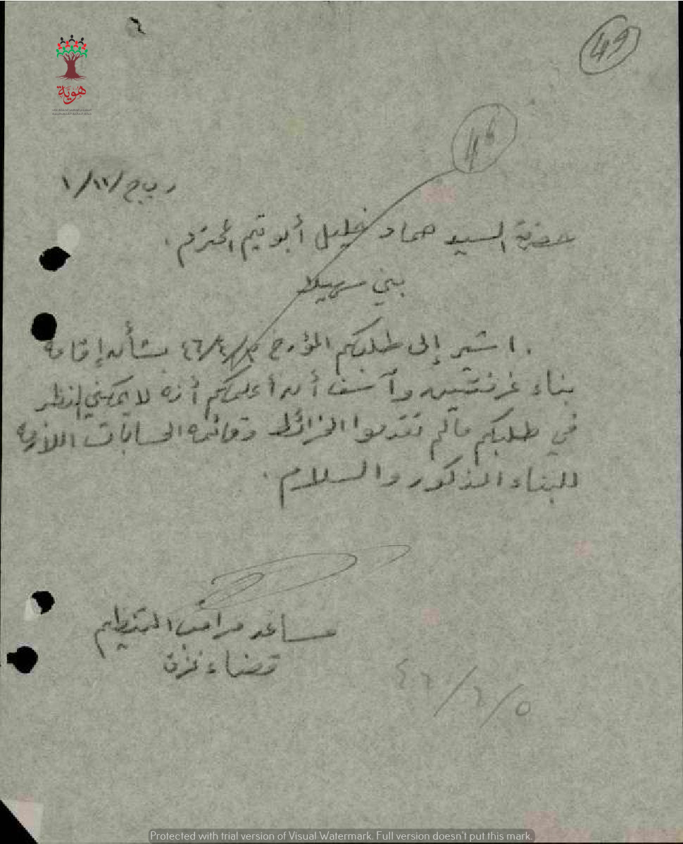رفض طلب البناء ل حماد خليل أبو تيم بتاريخ 3-4-1946 ما لم يقدم الخرائط والحسابات المطلوبة.