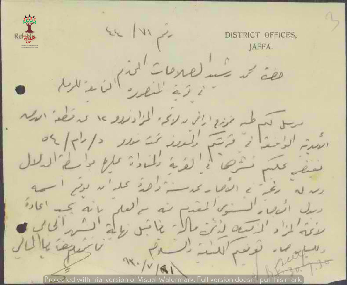 رسالة من قائمقام الرملة الى مختار المنصورة محمد رشيد الصلاحات بخصوص مزاد أرض الوقف الخيري