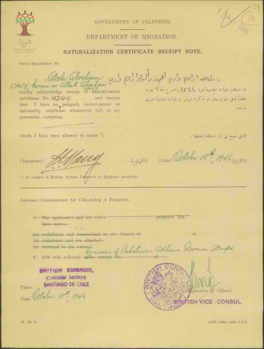 إيصال موقع من عطاالله إبراهيم الواوي باستلام شهادة الجنسية الفلسطينية