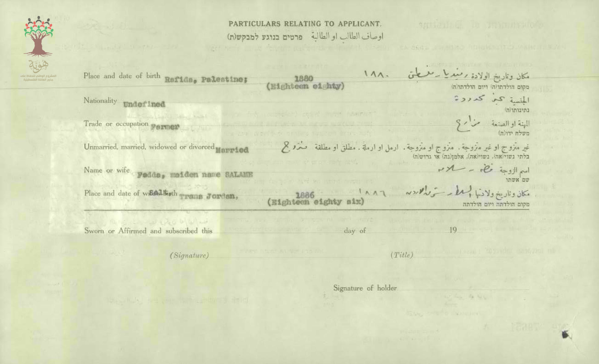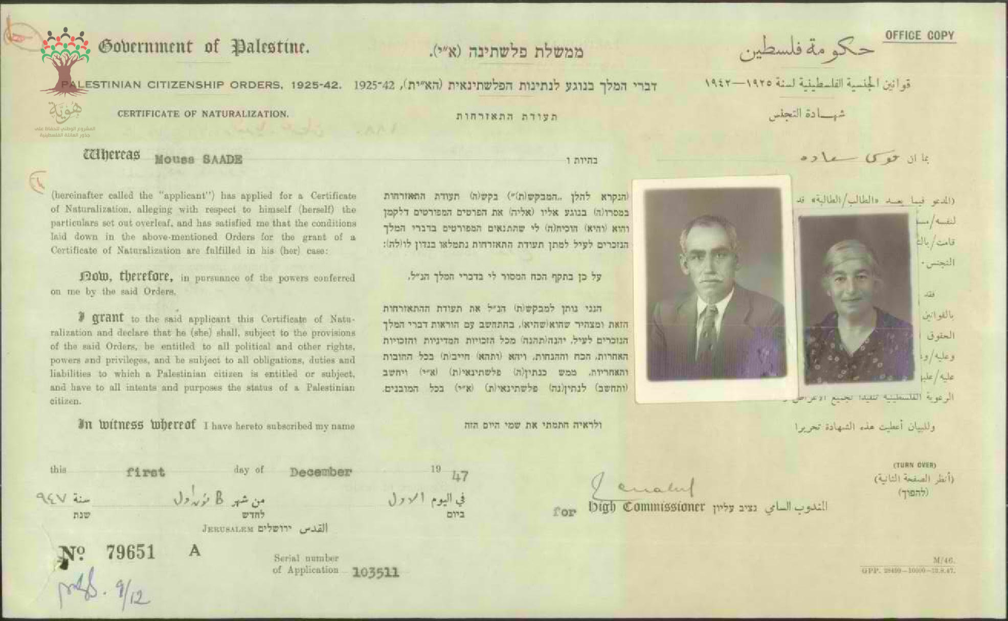 شهادة الجنسية الفلسطينية ل موسى سعادة وزوجته فضة سلامة