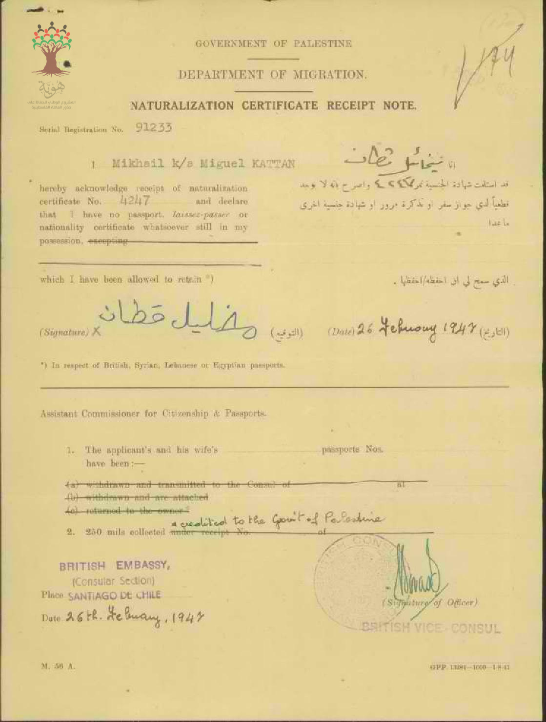 إيصال موقع من ميخائيل قطان باستلام شهادة الجنسية الفلسطينية