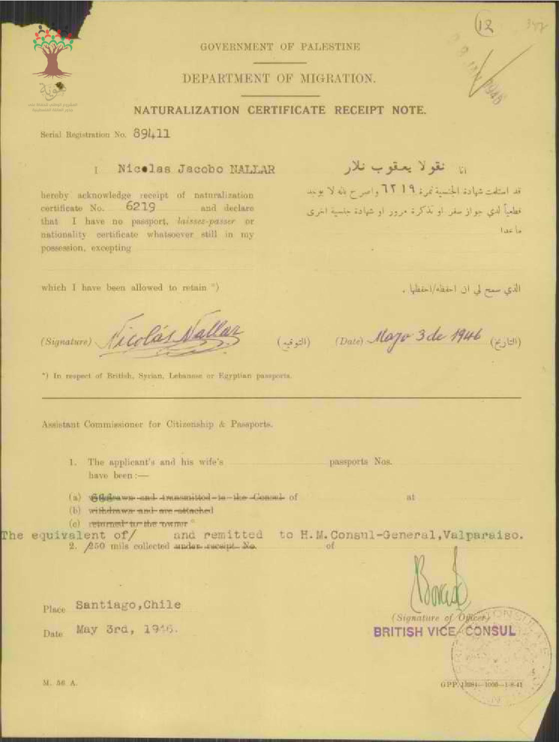 إيصال موقع من نقولا يعقوب نلار باستلام شهادة الجنسية الفلسطينية