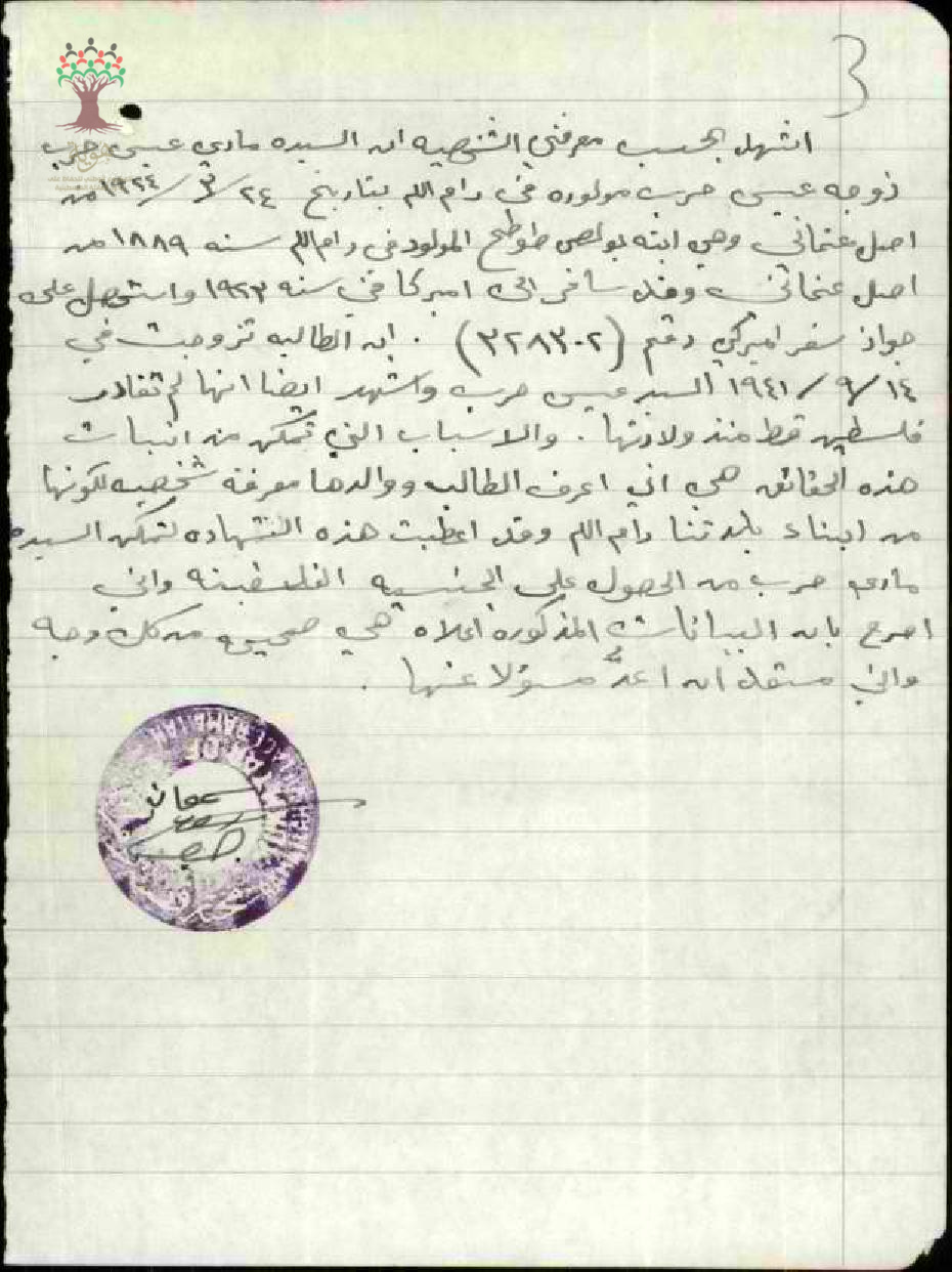 شهادة من المختار للسيدة ماري حرب(طوطح) بخصوص طلب الجنسية/رام الله