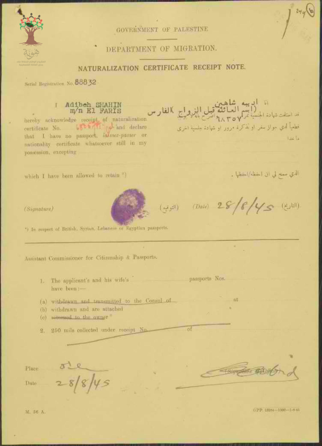 ايصال موقع من أديبة شاهين(الفارس) باستلام شهادة الجنسية الفلسطينية