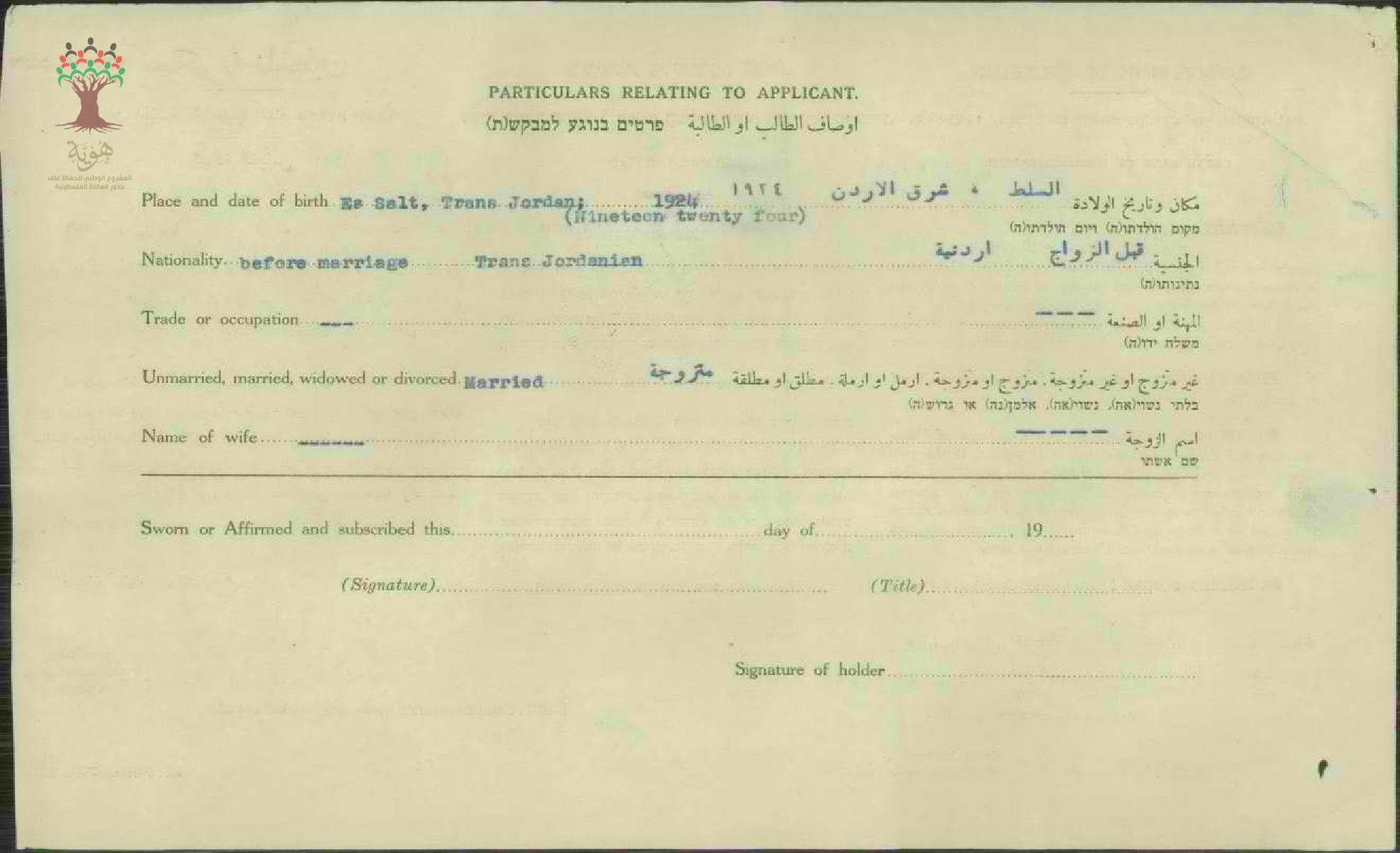 شهادة الجنسية الفلسطينية لأديبة شاهين(الفارس)