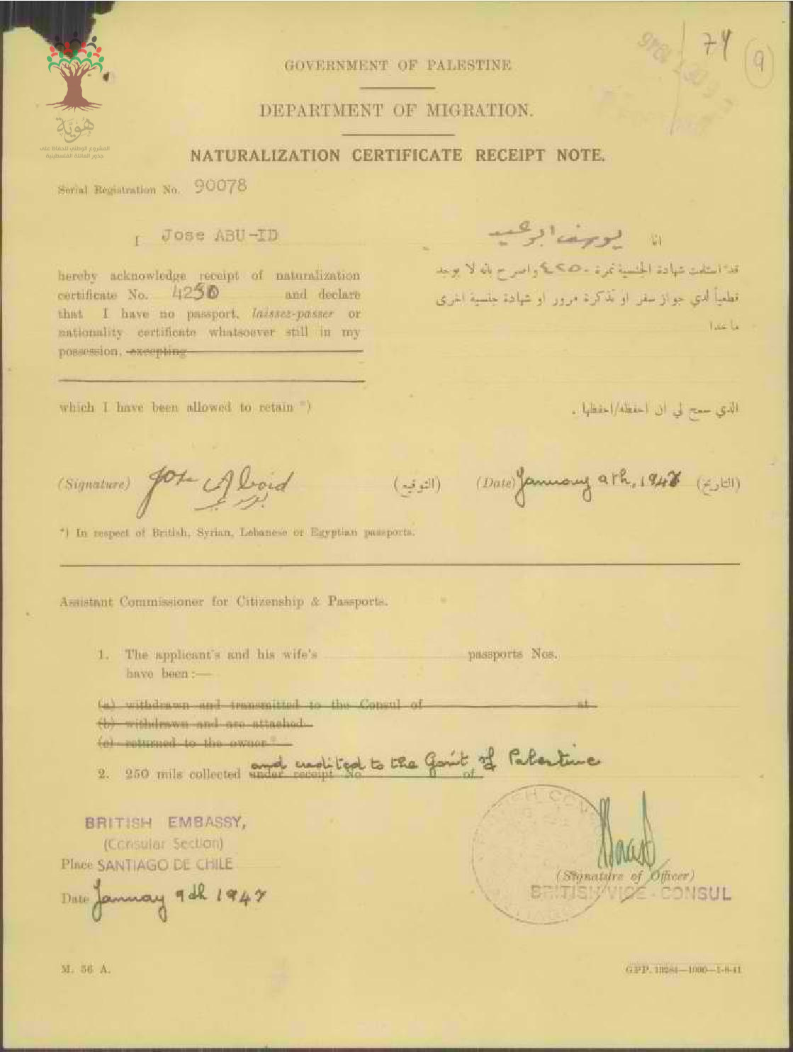 إيصال موقع من يوسف أبو عيد باستلام شهادة الجنسية الفلسطينية