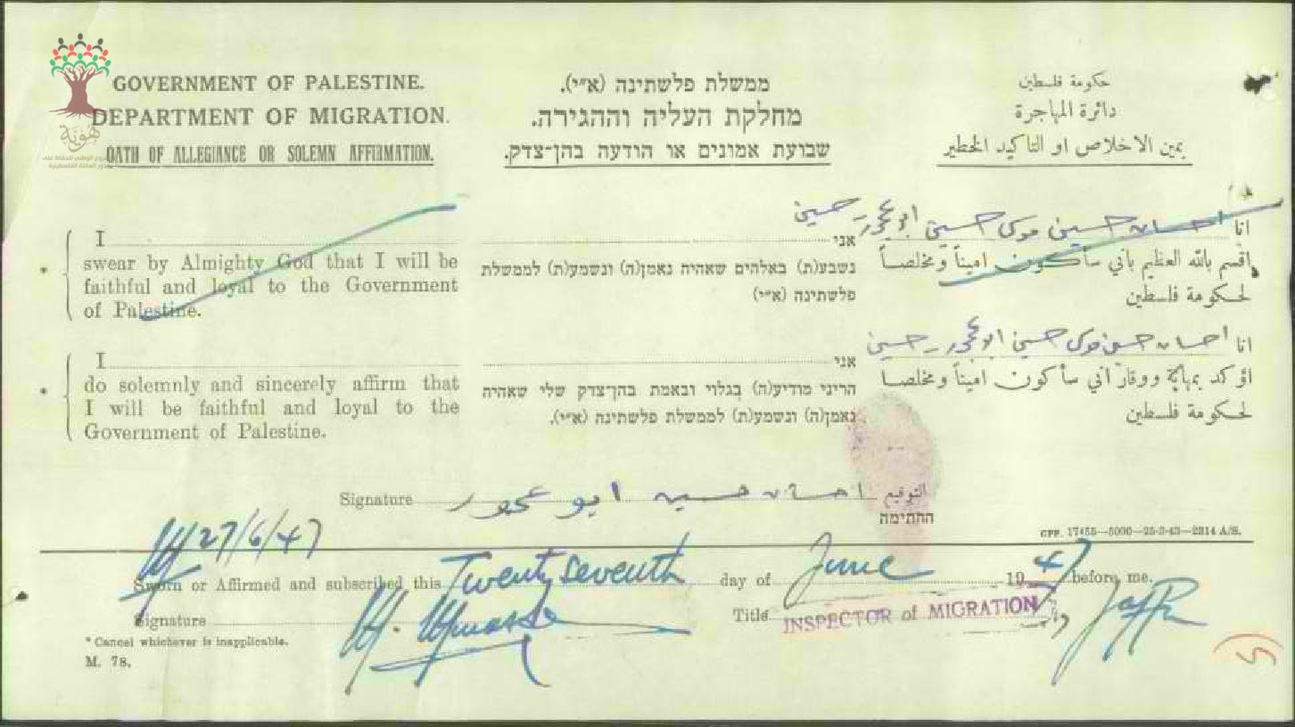 احسان حسين ابو عجور توقع على(يمين الاخلاص) للحصول على الجنسية الفلسطنية