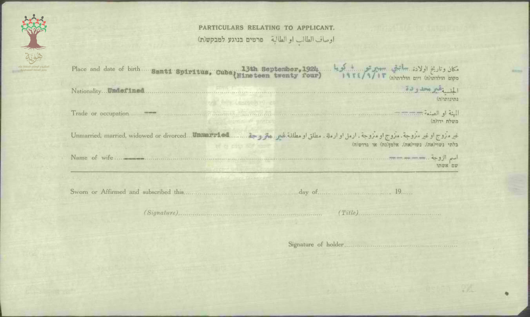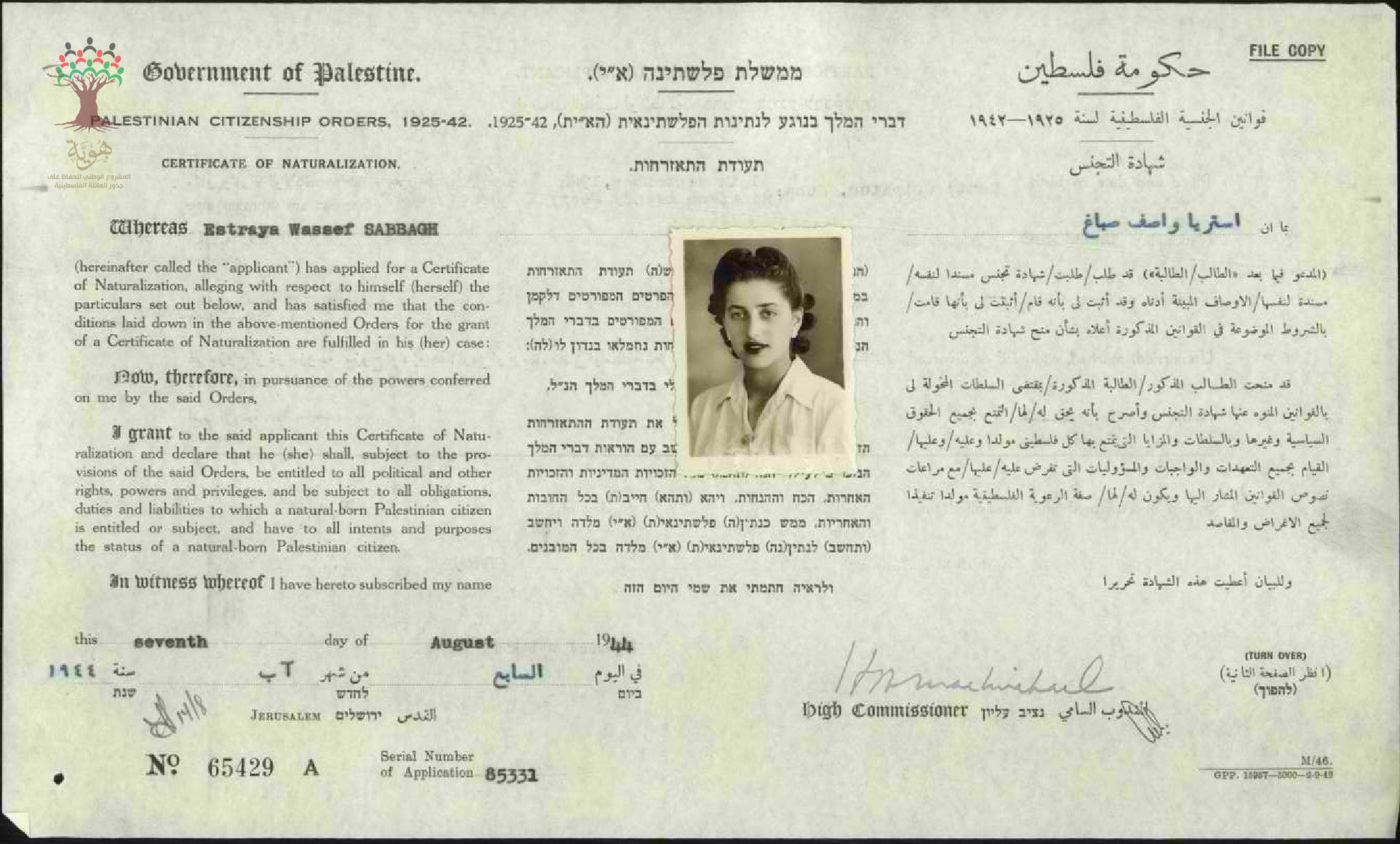 شهادة الجنسية الفلسطينية لاستريا واصف صباغ